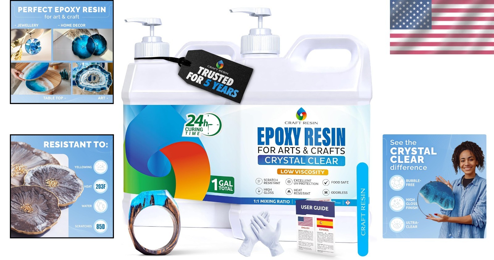 1 Gallon Crystal Clear Epoxy Resin Kit - Food Safe, UV Resistant & Easy Mix ‹ › ‹ › ‹ › ‹ › ‹ › ‹ › ‹ › ‹ › 1 Gallon Crystal Clear Epoxy Resin Kit - Food Safe, UV Resistant & Easy Mix ARTISAN APPROVED QUALITY: Unlock your artistic potential with our Crystal Clear Epoxy Resin and Hardener. Designed to create stunning pieces with a glass-like finish, you can trust that your creations will remain vibrant and free from yellowing over time. Perfect for: DIY Art Tabletop Coating Mold Casting Canvas and Coasters Jewelry Making BUBBLE-FREE, NO YELLOWING: Tired of bubbles and uneven finishes in your resin projects? Our advanced formula innovates the epoxy resin market by automatically releasing air bubbles when warm, recommended for depths of 1/4 inch, giving you a flawless finish every time. CERTIFIED, FOOD SAFE: is made with a minimal odor, non-toxic, and free of harmful VOCs & solvents. This food grade epoxy resin is perfectly formulated for both home and professional use, ensuring safety for you and the environment when used as directed. FAST CURING, HEAT RESISTANT: Experience rapid curing with our crystal epoxy resin, which hardens within 24 hours. It's scratch-resistant and can withstand heat up to 203℉ (95℃), leaving you with a flawless, glassy finish that will endure the of time. EASY TO USE, 1:1 RATIO: This two-part epoxy resin kit is designed for simplicity, making it perfect for beginners and seasoned artists alike. Each kit includes: Resin (1/2 gallon) Hardener (1/2 gallon) Reusable Mixing Stick Protective Gloves User Manual Upgrade your resin game and elevate your artistic creations to the next level with supplies. Order now and unleash your inner artist! Shipping Free & Fast Shipping - We offer free shipping to most of the USA with a normal delivery time of 3-7 days. However, due to the current situation, additional delivery time (up to 3 weeks) may be required for some items. Alternative Carriers - We may use alternative carriers (e.g. USPS, FedEx, UPS, etc.) to ensure your package arrives safely and on time. Due to the use of multiple carriers, we are unable to provide a tracking number automatically. Handling Time - Orders are processed and shipped within 1-2 business days of receiving cleared payment. Shipping Restrictions - Shipping to Alaska, Hawaii, Puerto Rico, Guam, and other US territories may incur shipping charges or delivery restrictions. Please contact us before ordering, or your order can be refunded/cancelled. State Restrictions - There may be restrictions based on your state of purchase. For example, certain items may not be shipped to California due to state regulations. Contact for Tracking Updates - If you require tracking updates or have any concerns about the delivery of your order, please feel free to contact us, and we will be happy to assist you. Return 30-Day Hassle-Free Returns - We want you to be completely satisfied with your purchase. If you are not, you can return the item within 30 days of receiving it for a full refund or exchange. Easy Return Process - To start a return, simply contact us and we will provide you with a prepaid return shipping label and detailed instructions. Restocking Fee - There are no restocking fees for returns. However, the buyer is responsible for return shipping costs if the return is not due to a seller's error. Refund Processing Time - Refunds will be processed within 5 business days of receiving the returned item in its condition. Payment We accept all major credit cards, PayPal, and Apple Pay for your convenience. Your payment information is secure and encrypted to ensure a safe and seamless transaction. Please complete your payment within 3 days of purchase to avoid any delays in shipping. Feedback Your feedback is extremely important to us. We strive to provide the best products and customer service possible. If you are satisfied with your purchase, please take a moment to leave us a positive review. If you have any concerns or issues with your order, please contact us before leaving negative feedback. We are committed to resolving any problems and ensuring your satisfaction. Contact Us If you have any questions or concerns, please feel free to out to our customer support team. You can contact us through the eBay messaging system. We are available Monday to Friday, 9:00 am to 5:00 pm EST, and we will do our best to respond to your inquiry within 24 hours. Buy it now and enjoy a pleasant shopping experience! Model: Epoxy Resin Kit MPN: Epoxy_Resin_Kit Unit Quantity: 1 Gallon