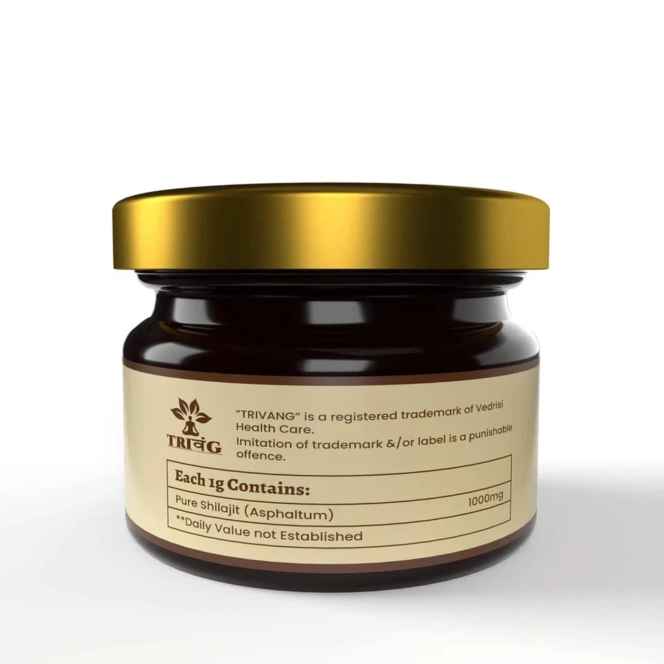 Enhanced endurance: Shilajit has been praised for its capacity to boost the oxygen supply to cells, thereby enhancing endurance and stamina during sports activities. The Natural Energy Enhancer: Experience a sustainable energy boost without the jitters and crashes that are associated with caffeine. Shilajit ensures a healthy energy balance all day long. Cognitive clarity: Shilajit's potent composition helps you focus and maintain health naturally. Recovering Muscles: Aid your body's natural process of recovering after exercising to reduce muscle fatigue, as well as aiding faster recovery. Healthy Vitality: Feel the benefits of holistic wellbeing through Shilajit. You will feel refreshed and focused throughout the day. Traditional Wisdom and Modern Convenience: Supported by decades of Ayurvedic tradition Our Shilajit resin has been easily designed for modern-day users looking for natural ways to improve their performance. Traditional Wisdom and Modern Convenience: Supported by decades of Ayurvedic tradition Our Shilajit resin has been easily designed for modern-day users looking for natural ways to improve their performance. In the box: 20 gm Shilajit resin in glass Bottle 1 Spoon Key Ingredients: Himalayan Shilajit Resin Benefits of Trivang Himalayan Shilajit Resin Reduce Fatigue Shilajit acts as an analgesic which helps to reduce the symptoms of chronic pain and chronic fatigue in daily life. It helps to restore the energy level and fight fatigue symptoms. Shilajit works on mitochondrial function and helps cells to produce more energy for the body. Slow Down Ageing Shilajit is a Himalayan herb which is rich in fulvic acid properties, so it could help reduce free radicals and slow down cell ageing. Its strong properties fight oxidative stress and increase longevity in the body. Shilajit is famous in mild age or old age people to slow down the ageing process and improve the overall health of the body. Good for Brain Shilajit provide nutrient for brain function. It may help to boost the memory, intelligence, thinking, behaviour and many more. Thanks to fulvic acid present in the shilajit which prevents the accumulation of tau protein and supports nervous functions. Directions For Use: 1. Mix 1 Scoop of shilajit resin in a glass of water 2. Mix well 3. Consume daily twice a day after a meal Note: It is recommended to suggest it to a healthcare professional before starting to use the Trivang Shilajit Resin. Remember, shilajit can lower blood pressure, so it is not recommended for people who already have low blood pressure. Moreover, shilajit is suggested for adults. Keep it away from the kids and children Safety Information: Store in a cool dry place Keep out of reach of children If you are pregnant or lactating or prone to any food allergy or under any medical condition consult your healthcare practitioner before use Disclaimer The above description is for information and knowledge purpose, not a healthcare professional advice. Please consult your doctor and/or pharmacist before you take this vitamin. Pregnant or lactating women, diabetics, hypoglycemics, and people with known medical conditions and/or taking drugs, should consult with a licensed physician and/or pharmacist prior to starting any supplementation program. The above statements have not been evaluated by the Food & Drug Administration.