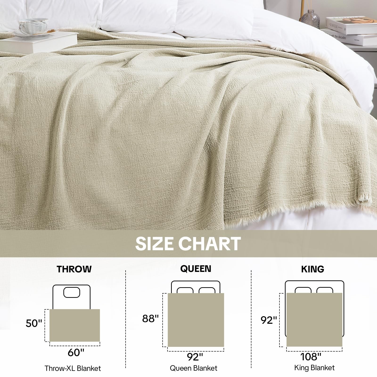 linen blanket 【100% Pure Natural Linen】linen throw blanket is made from premium-quality flax linen. Naturally breathable, absorbent and skin-friendly, offering a relaxed, soft touch that improves with every use. 【Oversized & Comfortably Weighted】Available in THROW (50"×60"), Throw-XL, 88"×92", and 92"×108". With expansive coverage and satisfying weight, this blanket doesn’t just fit your king-size bed — it wraps you completely, creating a cozy sanctuary on your sofa, bed, or on the go. 【Thicker & All-Season Comfort】Crafted with a thicker linen construction for enhanced softness and durability. Linen's inherent breathability keeps you cool and dry in summer, while its gentle insulation provides cozy warmth in winter. One blanket, intelligently comfortable in every season. 【Versatile for Bed, Sofa & Couch】Its earthy, textured look adds effortless sophistication whether draped over a bed, styled on a couch, or used as an elegant throw. Bringing a clean, timeless look to any living space. 【Care Instructions】To preserve its beauty and softness, we recommend gentle hand washing in cool water and laying flat to dry. Maintain fiber quality and long-lasting softness.