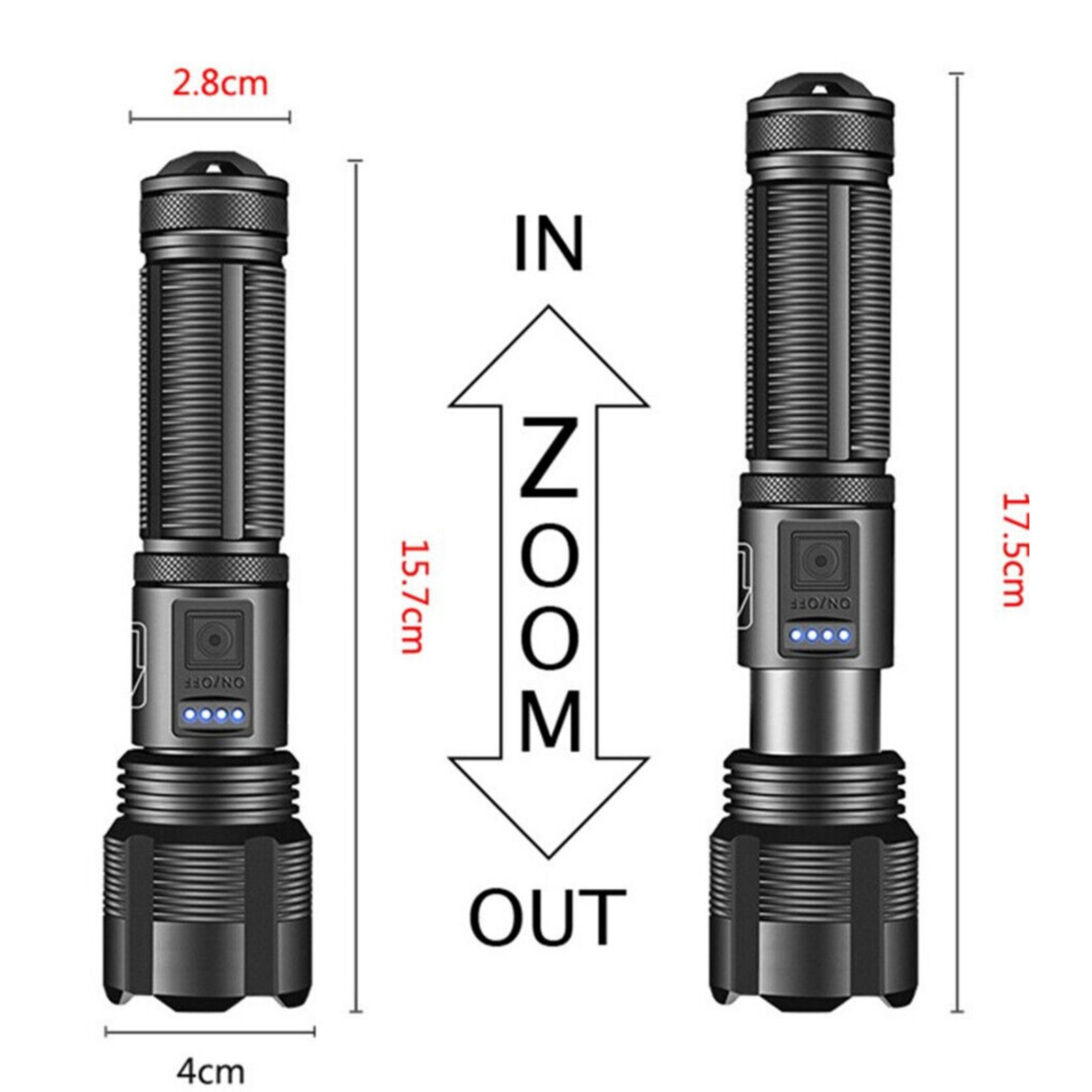 Product Description Features: 1. Material: high-quality aluminum alloy material, anti-slip handle, anti-fall and wear-resistant, long service life 2. Lamp beads: Using ultra-bright XHP70 wick, super long-range, can provide 1000 lumens of strong light, with an irradiation range of up to 100-200 meters 3. Variable zoom: The head can telescope and zoom, adjust the spotlight and floodlight according to the scene, and realize far and near lighting. It is powerful 4. Lighting mode: 5 levels (strong light/medium light/low light/stroboscopic/SOS), one-click switching to meet your various lighting needs 5. Power display: 4-segment intelligent power display light (25%-50%-75%-100%), you can observe the power anytime and anywhere, and you can charge it in time 6. Waterproof level: IPX4 waterproof level ensures it can be used in rainy days and is suitable for outdoor use. 7. Suitable for: camping, mountain climbing, night running, night fishing, exploring, night riding, dog walking, etc. It is an ideal choice for inspectors, repairmen, homeowners and craftsmen. Specifications: Name: Super Bright LED Flashlight Tactical Rechargeable LED Work Lights Colour: Black Lamp beads: XHP70 Battery capacity: 1500 mAh Lighting mode: 5 levels (strong light/medium light/low light/stroboscopic/SOS) Battery indicator light: 100%-75%-50%-25% Whether to zoom: Telescopic zoom Switch type: push switch Waterproof level: IPx4 Maximum range: 200m Net weight: 200g Package includes: 1* Flashlight 1* Battery 1* Charging cable Shipping Returns Contact Us Payment 1. Items sent from US warehouse. 2. Receiving time = Processing time + Shipping time. 3. Pro cessing Time: Around 1-2 business Days. 4. Shipping Time: 3-5 business day. it may have a little delay during some holiday (such as Christmas), any problem, please feel free to contact. 1. 30 days warranty from the purchased date. Please contact us via email before returning the defective item. 2. Our warranty does not extended to any product that are physically damaged or that are not under normal operating conditions as result of misuse or improper installation on the buyer/user's part. 3. Return items should include the original packaging and all accessories. buyers MUST contact us for the returning address. 4. In all cases, buyers pay shipping fees at their own cost to return products for exchange or refund. We will be responsible for the postage of replacements. Refund will be made upon receipt of the returned item. If you have any question, please e-mail us immediately, we will reply you as quickly as possible. We care about our valued customers, and will always try to help you. We accept all verified payment from eBay. Shipping 1. Items sent from US warehouse. 2. Receiving time = Processing time + Shipping time. 3. Pro cessing Time: Around 1-2 business Days. 4. Shipping Time: 3-5 business day. it may have a little delay during some holiday (such as Christmas), any problem, please feel free to contact. Returns 1. 30 days warranty from the purchased date. Please contact us via email before returning the defective item. 2. Our warranty does not extended to any product that are physically damaged or that are not under normal operating conditions as result of misuse or improper installation on the buyer/user's part. 3. Return items should include the original packaging and all accessories. buyers MUST contact us for the returning address. 4. In all cases, buyers pay shipping fees at their own cost to return products for exchange or refund. We will be responsible for the postage of replacements. Refund will be made upon receipt of the returned item. Contact Us If you have any question, please e-mail us immediately, we will reply you as quickly as possible. We care about our valued customers, and will always try to help you. Payment We accept all verified payment from eBay. You may also like 2Pcs Dryer Roller Wheel Drum Support Kit Replacement Part For Maytag Whirlpool 18.91 USD 3.99 USD 8PCS Hair Clipper Cutting Guide Combs With Metal Clip Replacement Tools For WAHL 13.38 USD 3.99 USD Leather Cushion Face Cover Eye Foam Mask Pad Anti-Sweat For Oculus Quest 2 VR 15.94 USD 18 Grids Watch Tiny Parts Storage Box Plastic Repair Acc Container + Dust Cover 11.75 USD Metal Bead Eyeglass Chain Glasses Strap Holder Lanyard Sunglasses Non-slip 8.93 USD Soft Rubber Dust Blower Air Pump Cleaner Watch & Camera PCB Repair Cleaning Tool 4.61 USD 3.99 USD powered by