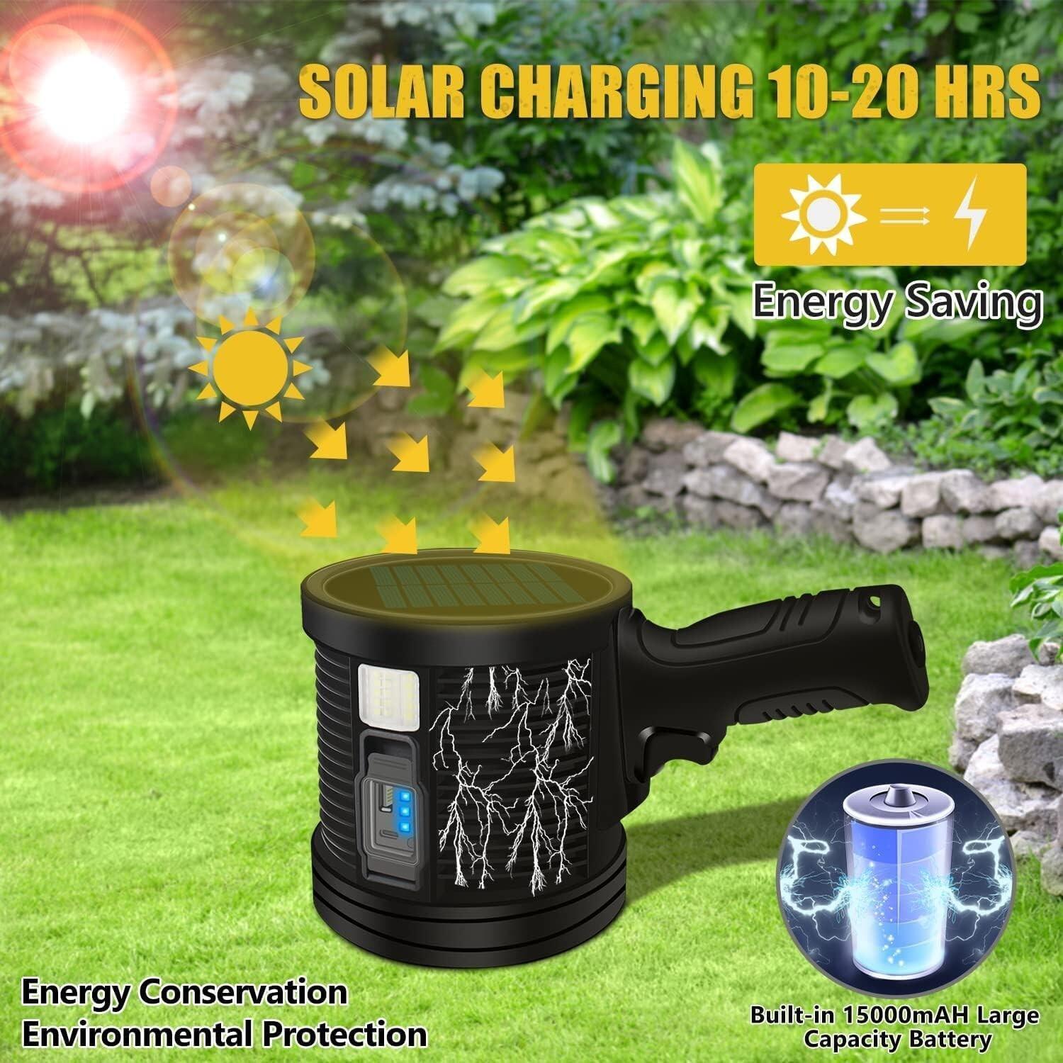 This spotlight is a beast! Incredibly bright with 6 useful modes, and I love that it's rechargeable via USB or solar. The foldable tripod is super handy for outdoor use, and the included colored lenses add versatility. The long-range beam makes it perfect for camping, emergencies, or even backyard fun. Very impressed with the build quality and battery life—definitely worth every penny!