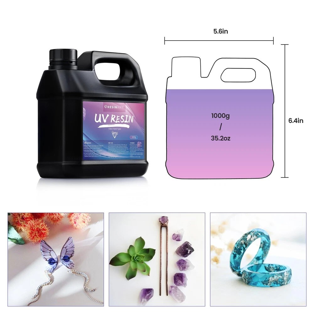 UV Resin 1000g, Upgrade Crystal Clear Hard Ultraviolet Epoxy Resin Glue, Low Odor Transparent Solar Cure Sunlight Activated Resin for Jewelry Making, DIY Craft Decoration, Mold, Casting and Coating Description Features: Superior QualityClear UV resin is self-leveling and self-degassing, resulting in a crystal clear, smooth, glass-like surface after curing. Scratch, stain and yellowing resistant properties protect your artwork and DIY projects for longer. This UV resin is ideal for a variety of creative and decorative projects. Efficient & ConvenientTransparent UV epoxy resin is easy to handle, no measuring required, just turn it on and use it. Short curing time, curing in 1-3 minutes under 36W UV lamp. Let you enjoy the results of your work in the shortest possible time. The matching nozzle can well help to squeeze and inject the resin. Safe & Non-ToxicWe are a professional resin manufacturer and the UV resin are all made from safe and non-toxic quality materials. It contains no harsh chemicals and is completely odorless after curing. Make your creative process a pleasure. Wide ApplicationClear UV glue is not only suitable for making jewelry, but can also be used for craft decorations, castings, coatings, sculptures and more. It can also be mixed with mica powder, colorants, glitter, sequins, etc. to create a more colorful surface for your crafts. Product Details: Brand: EPRESINART Material: Resin Compatible Material: Glass Item Form: Liquid Color: crystal clear Product Dimensions : 6.4 x 2.9 x 5.6 inches; 2.54 Pounds Item model number : UV Resin-3 Date First Available : July 20, 2023 Manufacturer : SHENZHEN JINHUA ELECTRONIC MATERIALS CO.,LTD. Country of Origin : China Best Sellers Rank: #5,285 in Arts, Crafts & Sewing (See Top 100 in Arts, Crafts & Sewing) #55 in Sculpture Molding & Casting Products #55 in Sculpture Molding & Casting Products Customer Reviews: 4.4 4.4 out of 5 stars 160 ratings Handling We will ship all orders within 1 business days of payment. Delivery We do not ship outside of the Continental US. Feedback We take our reputation seriously, we buy and sell online, so we understand the value of trust. If you are unsatisfied with your order, please contact us and we will work with you to resolve it to your satisfaction.