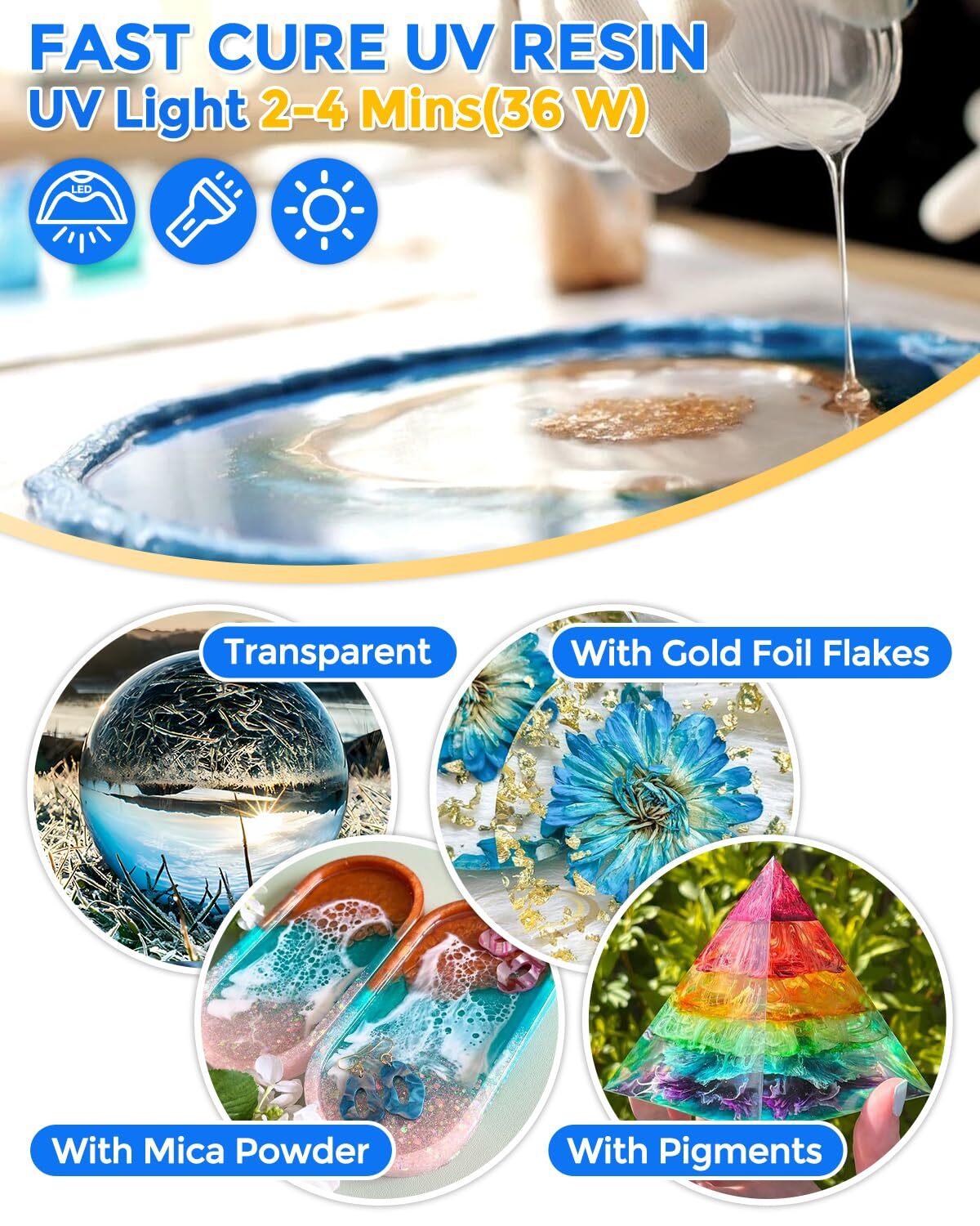 UV Resin 1000g, Crystal Clear UV Cure, Fast Curing & High Viscosity UV Epoxy Resin Hard Type, Premixed a UV Transparent Solar Activated Glue for Jewelry Making, Craft, Casting Superior Quality Clear UV Resin:UV resin is made of premium materials and developed and produced safely after long testing and improvement, has strong stain resistance and anti-yellowing, which is keep your DIY projects with a crystal clear surface, more long lasting. The cured resin uv is friendly for the resin mold Premixed For Efficient Use:Our uv resin epoxy is no measuring required, easy to use, just turn it on and use it. Short curing time, curing in 2-4 minutes under 36W UV light. It's simple to use even for beginners and professionals, and allows you to enjoy the finished work in the shortest time Safe and Low Odor: We are a professional uv resin manufacturer. Made of high quality material, the ingredient of our UV resin glue have been strictly checked, and has safety certification. It contains no harsh chemicals and completely odorless, non-toxic. harmless to you and the environment Bubbles Free & Self Leveling: You may encounter a few bubbles when you pour, but the bubbles will quickly rise and disappear. Additionally, its self-leveling properties ensure a smooth, even surface with minimal effort Wide Application: The Transparent resin UV work well with glitter, sequins, mica powders and pigments for a vivid, stunning result. Perfect for making jewelry, craft decorations, castings, coatings and more smaller projects Will You Get From UV Resin Kit ? 1 x 1000g uv resin clear 2 x gloves About UV light Curing time: Under the experiment, 2-4min under 36WUV light, and extend the time according to the actual thickness. (The best power of UV lamp is 36W) UV light: 6w above, the higher the wattage shorter the curing time. Why Choose Us: Non Toxic (has SGS safety certification) Yellow Resistant Self Leveling Self Defoaming Crystal Clear Hardness up to 90D Shrinkage Rate lower than 2% Quality Assurance Easy to Use 1: Pour the UV resin into the resin cup 2: Add your favorite resin pigment, mica powder or gold foil flakes, mix in tints gently 3: stir slowly and gently pour and wait 4: Under UV light for 2-4 minutes Operation Tips: 1. Please store the bottle of uv resin in a cool place. 2. Make sure the surface of the mould is clean and dry before pouring. 3. UV resin curing needs to be done under UV conditions. 4. Do not touch it with your hands immediately after UV irradiation. 5.Curing time is affected by factors such as UV resin thickness, UV intensity and colorant dosage. 6. Please feel free to contact us with any questions Shipping We offer FREE shipping on all orders! We ship within Three business days of payment, usually sooner. We use a selection of shipping services such as UPS, FedEx, USPS etc. We only ship to the lower 48 states, no APO/FPO addresses or PO Boxes allowed. Local pickups and combined shipping options are not provided at this time. Return You can return a product for up to 30 days from the date you purchased it. Any product you return must be in the same condition you received it and in the original packaging. Please keep the receipt. Payment We accept payment by any of the following methods: PayPal Please pay as soon as possible after winning an auction, as that will allow us to post your item to you sooner! Feedback Customer satisfaction is very important to us. If you have any problem with your order, please contact us and we will do our best to make you satisfied. Contact Us If you have any queries, please contact us via ebay. We usually respond within 24 hours on weekdays. Please visit our eBay store to check out other items for sale! Thank you for shopping at our store.