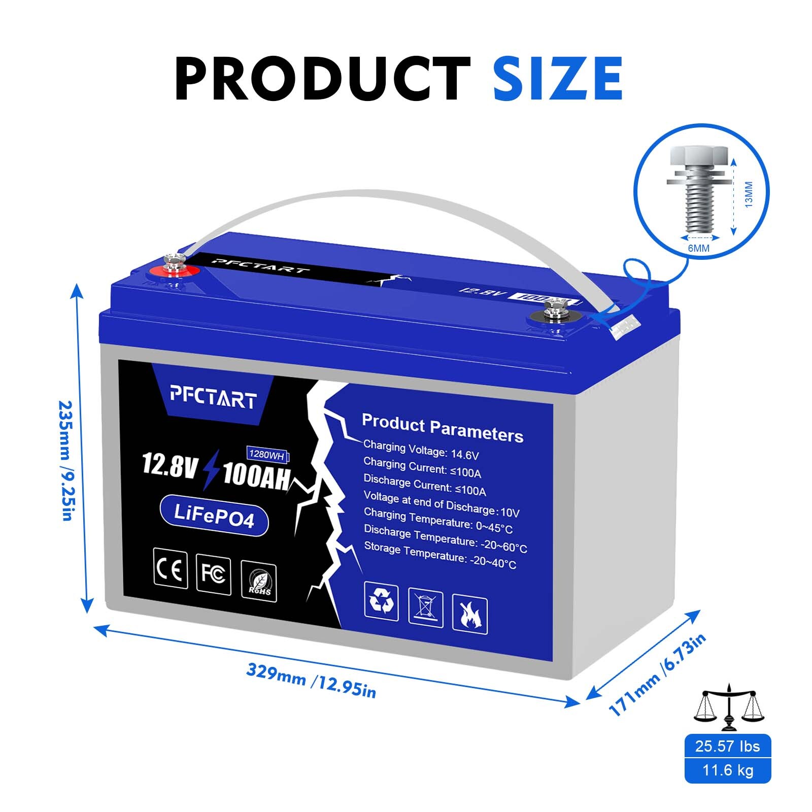 Product Description 100AH 12.8V Deep Cycle Lithium Battery LiFePO4 for Boat Home Garden Off-Grid Features 【 Automotive Grade Lithium Battery 】 PFCTART lithium iron batteries have exceptional quality since they are manufactured by Automotive Grade LiFePO4 Cells with higher energy density, more stable performance & greater power. Highest-level safety based on UL Testing Certificate for the cell inside the battery.This makes li-iron batteries perfect for solar home, RV, campers,motor homes, off-grid applications. 【 10 Years lifetime 】 PFCTART LiFePO4 battery provides 4500+ cycles, which is more than 10 times to Lead Acid with 300~600 cycles. PFCTART LiFePO4 battery has a 10-year service life, three times longer than the Lead Acid’s 3-year lifetime. 【 95%* Efficiency 】 PFCTART LiFePO4 battery’s flat discharge curve holds above 12.8V for up to 95%,of its capacity usage, providing astronomical boosts in run-time compared to only 50% in Lead Acid. This product is your best choice for outdoor camping power and indoor easy installation. 【 1/3* Lightweight 】 PFCTART LiFePO4 Battery weighs only 25.57 lbs for one module, only 1/3* the weight of lead acid batteries, which makes it an easy choice for RVs, Marine and Off-Grid Applications when mounting or mobility is in the consideration. 【 100% Protection 】 PFCTART LiFePO4 battery has built-in BMS (Battery Management System) to protect it from overcharge, over-discharge, over-current, and short circuit with excellent self-discharge rate. Built-in high-temp cut off prevents charging over 167 °F (75 °C). Without memory effect, no matter what state the battery is, it can be used as soon as it is charged. PFCTART LiFePO4 battery is IP65 level waterproof, which set you free from worrying to install indoors or outdoors. Specifications Battery type: LIFEPO4 MODEL: 100Ah 12.8V(4S1P) Rated capacity: 100Ah(1280WH) Normal voltage: 12.8V Discharge termination voltage: 10.0V Charging voltage: 14.6V Internal resistance: ≤180mΩ Single cell: IFR 3.2V 100Ah Standard charging. Continuous current: 0.2C5A Continuous voltage: 14.6V Cut-off current: 0.01 C Standard discharge: Constant current 0.2C5A end voltage 10.0V Max. charging continuous current: 100A Maximum discharge continuous current: 100A Operating temperature range. Charge: 0~45℃ Discharge: -20~70℃ Product size: 329*171*235mm Weight : 11.6kg ( 25.57lbs ) BMS protection Cell overcharge detection voltage : 3.90V±50mV Cell overcharge recovery voltage : 3.80V±100mV Cell over-discharge detection voltage : 2.00V±100mV Cell over-discharge recovery voltage : 2.30V±100mV Rated operational charge current : 100A Over current detection : 150±30A PCM impedance : ≤50mΩ Note BMS it supports a maximum of 48V series or 4 batteries of the same voltage and the same capacity in parallel installation, please fully charge the batteries before series/parallel installation to ensure that each battery is at the same voltage and the same capacity. About Us Payment Shipping Returns Contact Us Welcome to our store, your support is the biggest driving force for us to move forward. Our main businesses are solar panels, lithium iron phosphate batteries, electric vehicle chargers, solar outdoor/indoor lights, travel solar panels, etc . The product is directly connected with the factory to ensure product quality. Please rest assured to buy, we will provide you with a perfect shopping experience! We accept payment via Paypal only. Payment must be completed within 7 days. If you have any problems about payment, please contact us by ebay message. We only ship to confirmed eBay addresses. Please comfirm that your eBay address is in line with your shipping address. Most of our products are provided with shipping services. Also, the each additional item means exactly the the same color and size. The item shipping from USA. It takes about 5-10 working days to your addresses; Transit time may be a little delayed because of the bad weather. If you do not receive your item within 15 working days since payment finished, please contact us immediately for further assistance. If you have any issue about Item. Please contact us with 7 days since you receive the item and and return to us within 30 days from the delivery date for exchange or refund. If you need return, please contact our customer service representative, let us know the detailed problem and send us some pictures for confirmation. We strive for 100% customer satisfaction! Positive Feedback is very important to us. If you have any questions, please feel free to contact us via "Ask seller a question" . We will reply your email within 24 working hours. About Us Welcome to our store, your support is the biggest driving force for us to move forward. Our main businesses are solar panels, lithium iron phosphate batteries, electric vehicle chargers, solar outdoor/indoor lights, travel solar panels, etc . The product is directly connected with the factory to ensure product quality. Please rest assured to buy, we will provide you with a perfect shopping experience! Payment We accept payment via Paypal only. Payment must be completed within 7 days. If you have any problems about payment, please contact us by ebay message. Shipping We only ship to confirmed eBay addresses. Please comfirm that your eBay address is in line with your shipping address. Most of our products are provided with shipping services. Also, the each additional item means exactly the the same color and size. The item shipping from USA. It takes about 5-10 working days to your addresses; Transit time may be a little delayed because of the bad weather. If you do not receive your item within 15 working days since payment finished, please contact us immediately for further assistance. Returns If you have any issue about Item. Please contact us with 7 days since you receive the item and and return to us within 30 days from the delivery date for exchange or refund. If you need return, please contact our c