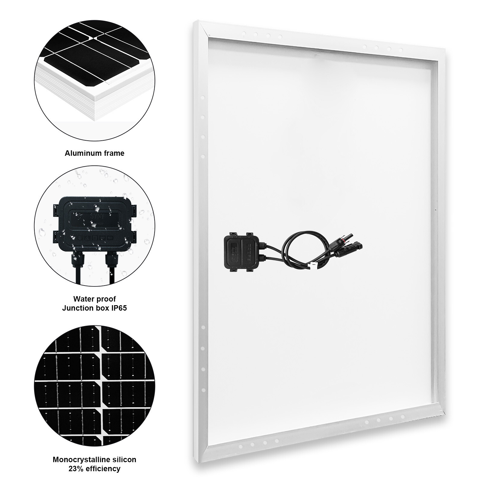 1 Pair Black+Red Solar Panel Extension Cable Wire Solar Connectors 10 AWG Gauge 9.88 USD Free shipping 20 Pairs NEW Male Female M/F Wire Cable Connector Set Solar Panel 30A Waterproof 8.49 USD Free shipping 100Watt USB Portable Fast Charger Waterproof Solar Power Bank for Cell Phone 15.99 USD Free shipping Solar Panel Y Branch Parallel Adapter Cable Wire Connection Extension Connector 6.83 USD Free shipping 20 Pairs Cable Connectors Solar Panel 30A Line Plug Socket Male Female IP65 6.58 USD Free shipping 200W 12V Solar Panel High Efficiency Moncrystalline Module RV Marine Boat Home 130.88 USD Free shipping Waterproof Male Female M/F Solar Panel Wire Cable Connector Set 5/10/20 Pairs 6.99 USD Free shipping 100W Solar Panel Folding PV Power Bank Outdoor Camping Hiking USB Phone Charger 15.19 USD Free shipping PFCTART 400W Solar Panel 12V/24V/36V/48V High-Efficiency Mono Solar Module RV 68.88 USD Free shipping 200 Watt Solar Panels 12/24 Volt Monocrystalline PV Charger Off-Grid for Rooftop 130.98 USD Free shipping 12V 100W Solar Panel Monocrystalline PV Power Charger for RV Boat Home Rooftop 69.99 USD Free shipping 10 AWG Solar Panel Extension Cable Wire Connector Set for Solar Panel Kits US 8.99 USD Free shipping 100 Watt 12 Volt Monocrystalline Solar Panel is the perfect option for any off-grid application. Ideal for RVs, motorhomes, cabins, marine areas, home backup power, and more. The panels feature lightweight aluminum frames and shatter-resistant glass, making them perfect for outdoor applications. Features: 【High Conversion Efficiency】 Over 90% transferable power output in 10-year, 80% transferable power output in 20-year. Under 8 hours full sunshine: 100W solar panel generating 0.8KWH per day 【Upgraded Design】PFCTART monocrystalline solar panel upgraded the latest half-cut cell technology, which makes the solar panels obtain better and more stable performance. Compared to regular solar panel, half-cut cell technology can reduce power loss, lower solar panel temperature and reduce the impact of shading on performance. 【Easy to install】 It comes with pre-drilled mounting holes, solar connector leads, and a junction box. Allowing you to install, connect it to a controller, or expand with panels without breaking a sweat. The panels are made of premium Grade A+ monocrystalline solar cells that are more efficient than conventional polycrystalline solar cells. 【High Quality】 The panel is covered with a special glass to protect against the bad environmental conditions. Good quality frame, withstands high winds (2400Pa) and snow loads (5400Pa). 【Built to Last】Corrosion-resistant aluminum frame of this solar panel provides extended outdoor use that ensures the panel can last for decades. The IP65-rated junction box is versatile due to its ability to withstand dirt, dust, debr is, and low-pressure water jets. Specification: 100W Solar Panel High Efficient Monocrystalline Maximum Power: 100W Open Circuit Voltage (Voc): 21.6V Maximum/Peak Voltage(Vmp): 18V Short Circuit Current (Isc): 6.2A Working Current (Iop): 5.55A Output Tolerance: ±3% Charge Voltage: 12V Frame: Aluminum alloy frame Temperature Range: -40℃ to +80℃(-40°F to +176°F) J-Box IP Rating: IP65 Product size:76*58*3 cm(29.92*22.83*1.18inch) Net weight: 4.58 KG How Many Solar Panels Do You Need To Buy? 1-4 Solar Panels For Boat power generation 1-6 Solar Panels For RV Power Generation 1-30 Solar Panels For House power generation More Welcome to consult ! Packages Includes 1 x 100W Mono Solar Panel