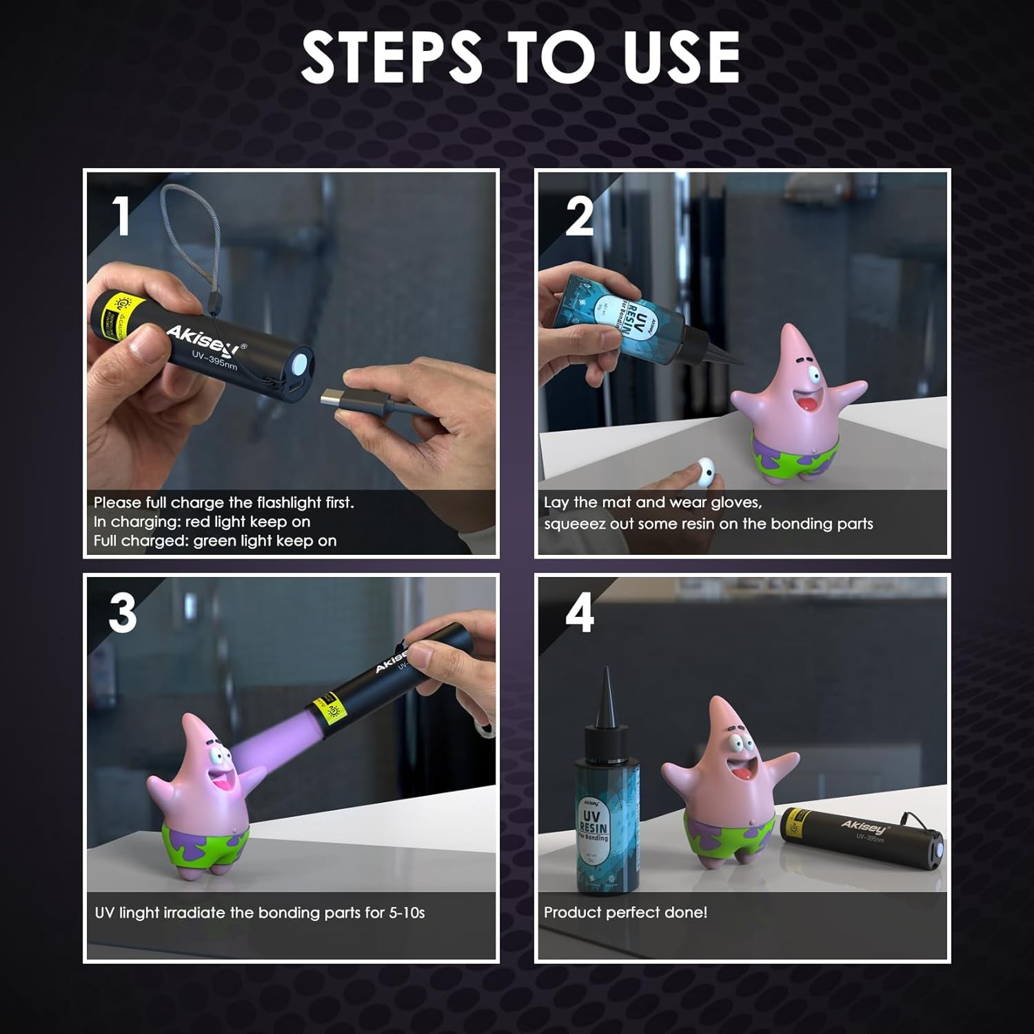 Free eBay listing template designed by dewiso.com UV Resin Kit with Light, 100g UV Resin with Rechargeable 395NM UV Flashlight, Fast Curing in Seconds, UV Glue Adhesive for Bonding Jewelry, Plastic, Glass Repair, w/Mat, Gloves, Storage Bag FREE AND FAST SHIPPING! About this item 【UV Resin Kit With Light】 - Akisey UV resin for bonding has low viscosity and strong adhesive. Under the irradiation of 395nm UV flashlight, the UV resin can fast cured in just 5-10s. Meanwhile comes with 7.8x7.8in Silicone Mat, A pair protective gloves, A storage bag, what we offered is for your better bonding experience 【100g Strong UV Resin】 - The bonding UV resin keeps liquid state before curing with UV flashlight, which is convenient for you to adjust and shape. After curing, it is odorless, high transparency , no yellowing and hard. Akisey will provide perfect glue for your artistic creation and helpful in the daily life. 【Powerful UV 395nm Flashlight】 - The flashlight provides 1300mw and 395nm wavelength with upgraded lamp beads, which make the light reaction is more efficient, and dedicated to surface curing. The flashlight is powered by built-in 400mAh battery and with the measures of 3.2x0.8in, it is small enough to be carried to anywhere. (Tips - Do not look at the UV light directly while using) 【Multi-Purpose】- Our UV resin kit with light is designed for bonding small ornaments with transparent objects such as resin, acrylic, glass, etc., and also be used for welding between glass, metal and plastic. For better curing, we strongly recommend one of the two objects should be transparent at least. 【180-Day-Warranty!】 - Any question about the UV resin kit will be solved if you contact us on AMZ. Akisey official offers excellent customer support and will be responsible for your dissatisfaction (include free replacement/refund). Product We offer a 30-Day Return Policy on items which you are not completely satisfied with. You have the option for a full-refund or an exchange of the item. No returns are available on items shipped outside of the US . Shipping We offer Free Shipping to the US and ship within 2 business days of payment, usually sooner. We use UPS express shipping. That's why your products are usually delivered within 3 days . Contact We try our very best to make sure every customer is completely satisfied. If there's a problem , message us! We're happy to help. 24/7 live chat available.