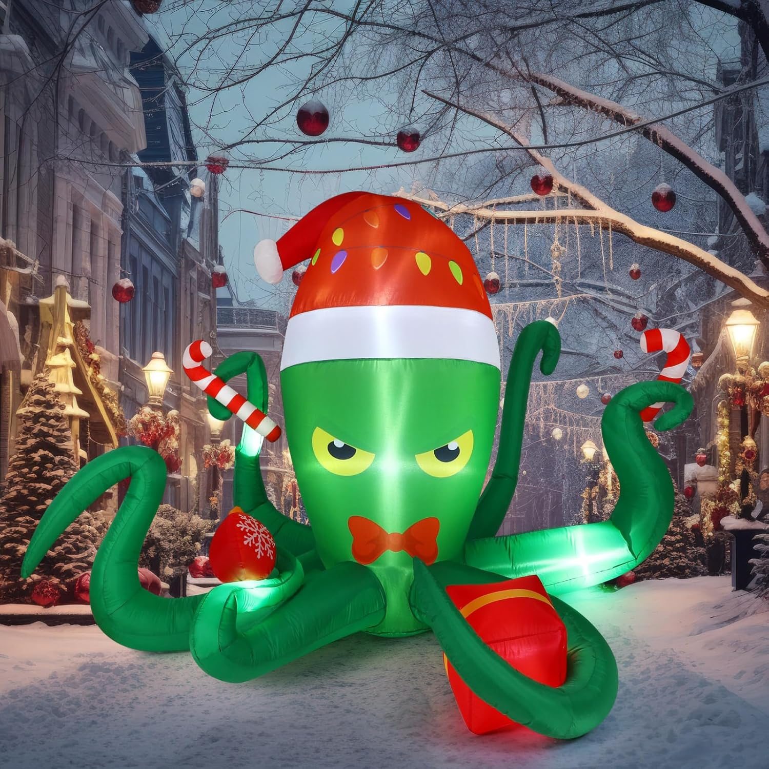 Christmas Inflatable Outdoor Decorations: the package comes with 1 Christmas inflatable octopus with Santa hat, about 10 ft in height, 4 weight pockets, 4 ropes, 4 stakes, 1 plug and a fan; The octopus makes it a delightful addition to your yard Reliable Material: this blow up Christmas Octopus outdoor decoration is made of PVC, reliable and waterproof, no fading, even in bad weather such as rain or snow, the inflatable can continue to work, for a long lasting using; Please keep the plug dry Easy to Use: the octopus inflatable has a built in powerful fan, only plug it in, the inflatable will show up in minutes, then use the ropes and stakes to keep it stable and provide better wind resistance, and when you don't want to use it, you can deflates effortlessly for storage, saving your space Bright LED Lights: our Christmas octopus inflatable decoration has LED lights inside, bright and charming, which can illuminate your lawn or garden at night, attracts the attention of neighbors at night, letting you have a Christmas different from the past Outdoor Large Inflatable Decoration: this inflatable Christmas octopus decoration is suitable for various outdoor occasions, such as festivals, terraces, gardens, lawns, courtyards, etc. It is very suitable for decorating your home and garden, allowing your family and friends to immerse themselves in the festive atmosphere and creating a more profound festive ambiance Features: The Christmas inflatable octopus is made of waterproof material, reusable and reliable, ideal for indoor and outdoor use, which will create a Christmas holiday atmosphere for your family and children. This Christmas blow up decoration is suitable for decorating yard, park, garden, lawn, Christmas, party and more, the built in LED lights will catch your neighbor's eyes, creating a warm festival atmosphere in your yard. Specifications: Material: PVC Color: Multiple color Size: Height: 10 ft Package includes: 1 x Christmas inflatable octopus with Santa hat 1 x Power adaptor 1 x Fan 4 x Weight pockets 4 x Ropes 4 x Stakes Notes: Manual measurement, please allow slight errors on size. The color may exist a slight difference due to different screen displays Do not overinflate the balloons to avoid bursting