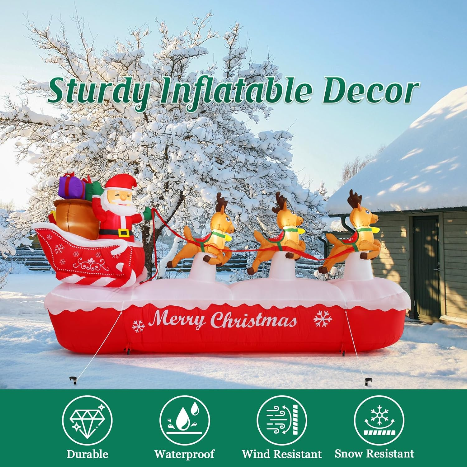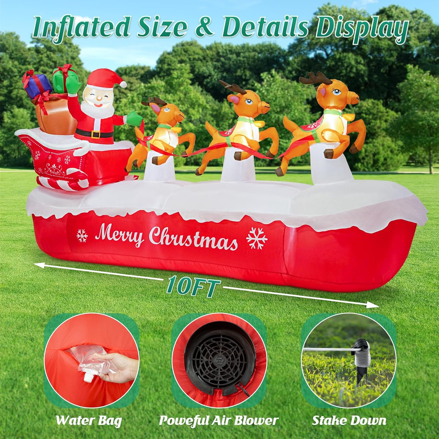 Magic Christmas Decor: Recreate a festive fairytale outdoors or indoors! This 4.5 Pounds inflatable Santa sleigh with Elks shines in yards, gardens, patios, roofs, malls, and family parties. Built-in warm white LEDs cast storybook charm, while the hand-sketched Santa brings delivers tangible magic for unforgettable childhood memories Stormproof & All-Weather Durability: Rugged waterproof polyester withstands Ultra-Low Temperature snow and rain.Adopting new reinforced stitching and upgraded materials, it dual-reinforces structural stability in outdoor scenarios. Snow wipes clean instantly – enjoy worry-free holidays Giant Size & Premium Details: 10 FT long giant display delivers maximum visual impact! Features hand-stitched details on waving Santa and reindeer reins for lifelike movement. Upgraded snowflake-resistant fabric with reinforced seams ensures flawless display year after year 3-Step Setup: Load 4 water bags into the bottom compartment and seal; plug in the UL blower to fully inflate Santa, sleigh, and reindeer in 60 seconds; then drive 8 stakes into the ground for fixation — delivering rock-solid stability even through severe storms! Zero assembly hassle Complete Holiday Package: Unbox it all: Inflatable Santa sleigh with reindeer, UL adapter, blower, 8 stakes, 4 tethers, and 4 water bags. Just unpack and create instant holiday magic. Then folds 90% smaller post-Christmas for easy storage Product description