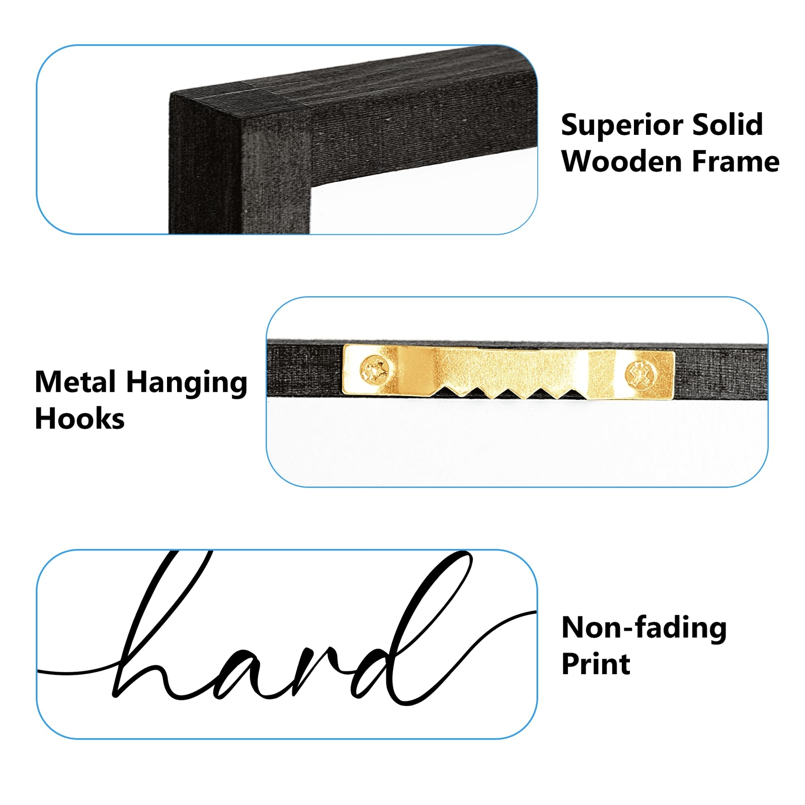 MOTIVATIONAL FRAMED WALL ART: Stay Positive Work Hard Make it Happen office wall decor has the subliminal motivation that can be seen daily, simple and easy to read. Whenever you start to feel stressed you just look up, read the wall hangings, take a deep breath and bring yourself back to enthusiasm! BRING LIFE TO OFFICE: The quotes wall decor will add some character to your space while spreading good vibes. Plus, it's a great conversation starter during those Zoom meetings! They are honestly something you choose to see and read daily, when there are good and down times in the workplace. EXCELLENT CRAFTSMANSHIP: The framed motivational wall decor is well printed and detailed on the durable cardboard with solid pine wood frames. Each word is sharply printed, clear and graceful black lettering against a white background is a perfect color match, which captures the eye. READY TO HANG WALL DECOR: The inspirational wall art is lightweight, equipped with little wall brackets built into the back of them that makes it very easy to hang with just one nail. Mounting screws are included in the package. It only takes a couple of minutes to get the job done, or just sit it somewhere. ELEGANT DESIGN: The pictures wall decor is simple in design that goes well with different decor styles and wherever you need a little pep in your step: workspace, classroom, man-cave basement area, home office, college dorm, basement hangout area, workout space, and kids room to remind them to always be positive and motivated!