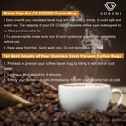 Coffee tumbler is the perfect companion for coffee lovers. 12oz capacity, easy to grasp and to-go, suitable for most standard car cup holders and coffee pots. Let you enjoy a good coffee life anytime, anywhere. Instructions for use: 1.Before use,please disinfect with boiling water. 2.The cup buckle can be closed tightly after two "clicks". 3.Hand wash only, the dishwasher is not recommended. 4.Made of stainless steel,cannot put in the microwave. LIFETIME GUARANTEE CS CODDDI provides a lifetime guarantee to every customer, if you have any problems about this travel mug (such as material issues, workmanship issues, defective products and replacement lids), please feel free to contact us, we will solve all the problems for you or full money-back. Healthy Material - The Vacuum double wall was made of high quality grade 304 stainless steel that completely taste-free, rust-proof, leak-proof, The lid was made of food-grade silicone, BPA free, guaranteed high durability. Leakproof Design - The coffee mug lid comes with an airtight silicone seal that prevents the drinks from spilling. Air Vent on the lid allows beverages to flow out smoothly, without gushing or overflowing.The rubber design at the bottom prevents the cup from slipping or tipping. Perfect Capacity - 12oz capacity, small and beautiful, easy to carry,Narrow body design makes it easy to grab and go, also fits most car cup holders and coffee makers. Easy to Carry - Enjoy your coffee easily wherever you go. Suitable for use indoor&outdoor, such as home, parties, travel, school, riding,and office time. Use Notes - The coffee cup buckle can be closed tightly after two "clicks",Hand wash only, the dishwasher is not recommended.cannot put in the microwave.