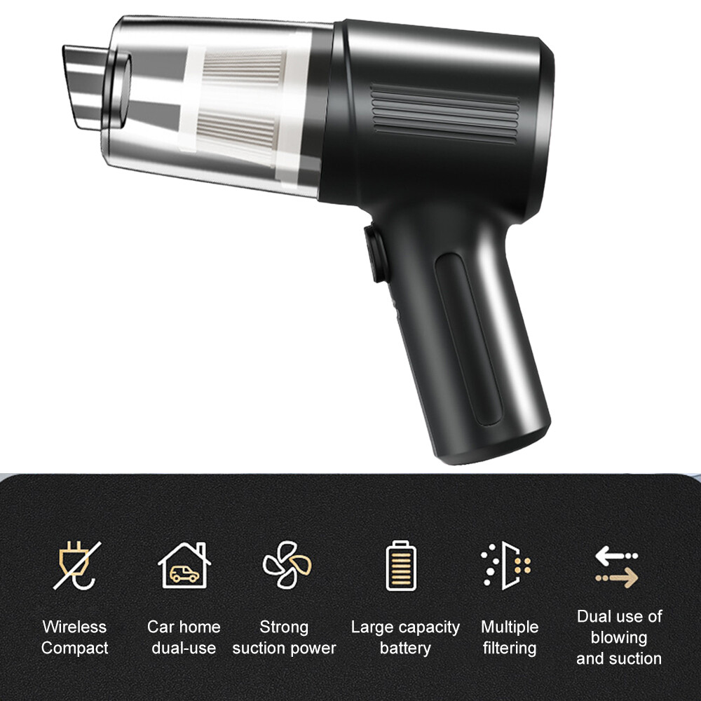 Features: 1. Convenient charging, long life: built-in rechargeable battery, no need for frequent replacement, a charge can meet the needs of many car cleaning, easy to open the repeated use mode, say goodbye to the traditional battery replacement of cumbersome and cost. 2. Wireless portable, easy to use : completely free from the wire bondage, enjoy the convenient experience of wireless operation. Regardless of the layout of the space in the car, you can freely travel to all corners, move freely and clean without dead ends. 3. Strong suction power, stains: 120W strong power to give its excellent suction performance, whether hidden in the crevices of the fine dust, or stubborn stains and debris, can be swept away, but also the interior environment of the car fresh and clean. 4. Wet and dry, easy to clean: unique wet and dry function, easy to deal with different types of cleaning problems in the car. Whether it is spilled liquid or accumulated dust and hair, all can be efficiently dealt with, a car cleaning, multi-purpose covered. 5. Compact size, convenient storage: delicate and compact body design, easy to store and carry, does not take up valuable space in the car. Access at any time, instantly transformed into a small car cleaning guard, for you to create a clean and comfortable driving environment. Specifications: 【Product Name】:Mini car hoover blowing suction pumping all-in-one 【Product colour】: Black / Pink 【Product Style】: Wireless models 【Product Material】: Plastic 【Rated voltage】: 3.7V 【Charging voltage】: 5V 【Power】: 120W 【Vacuum Suction】: 20000Pa 【Battery Type】:Built-in 1200 mAh lithium battery 【Charging port】: Type-C interface Packing list: 1 x Vacuum Cleaner 1 x Brush 1 x Flat Nozzle 1 x Blowing nozzle 1 x Type-C charging cable 1 x User Manual Attention: 1. The colour of the item may be slightly different from the picture due to different light and screen settings. 2. Please allow 1-2cm size difference due to different manual measurement. On Dec 24, 2024 at 00:50:24 PST, seller added the following information: