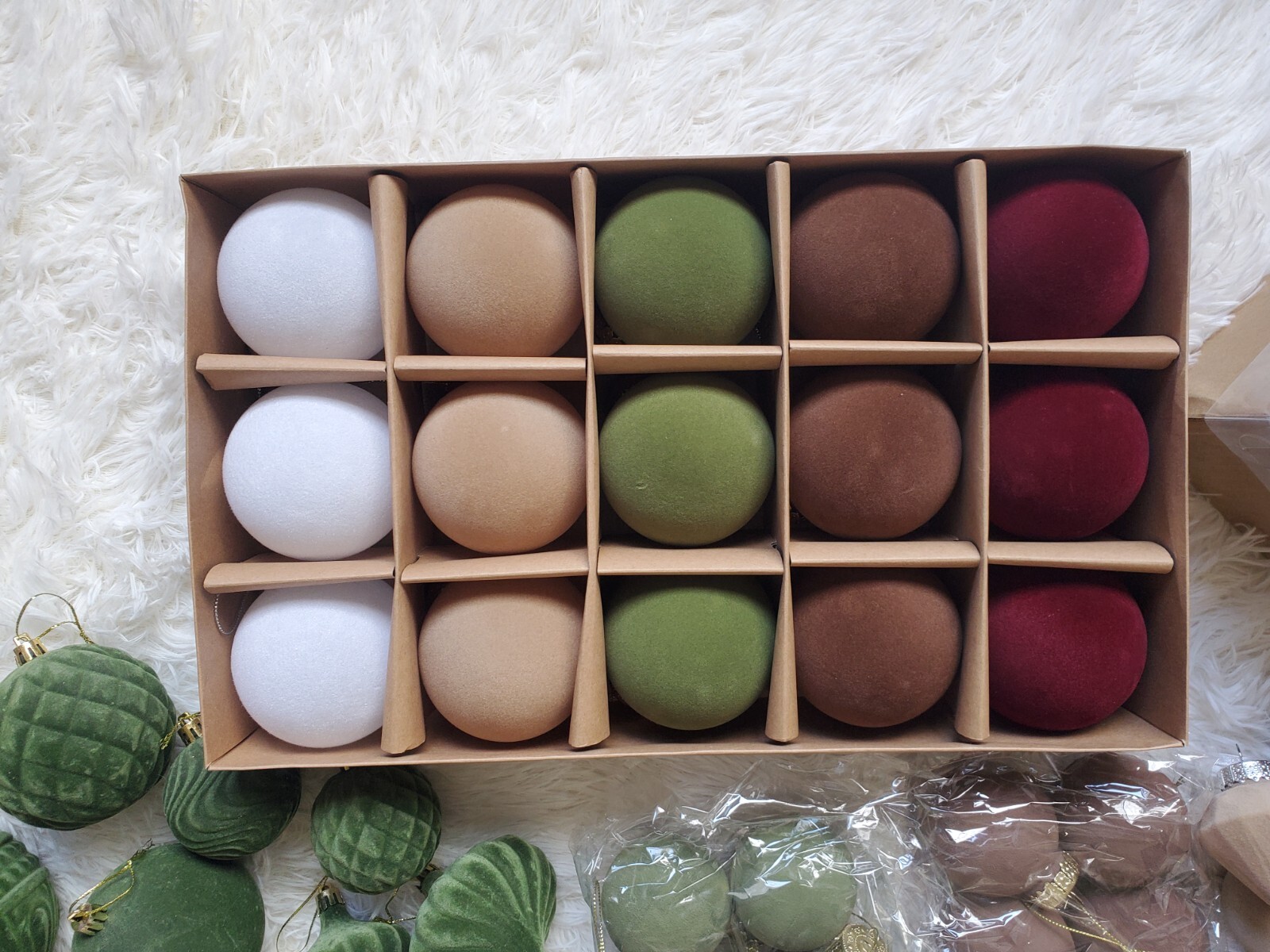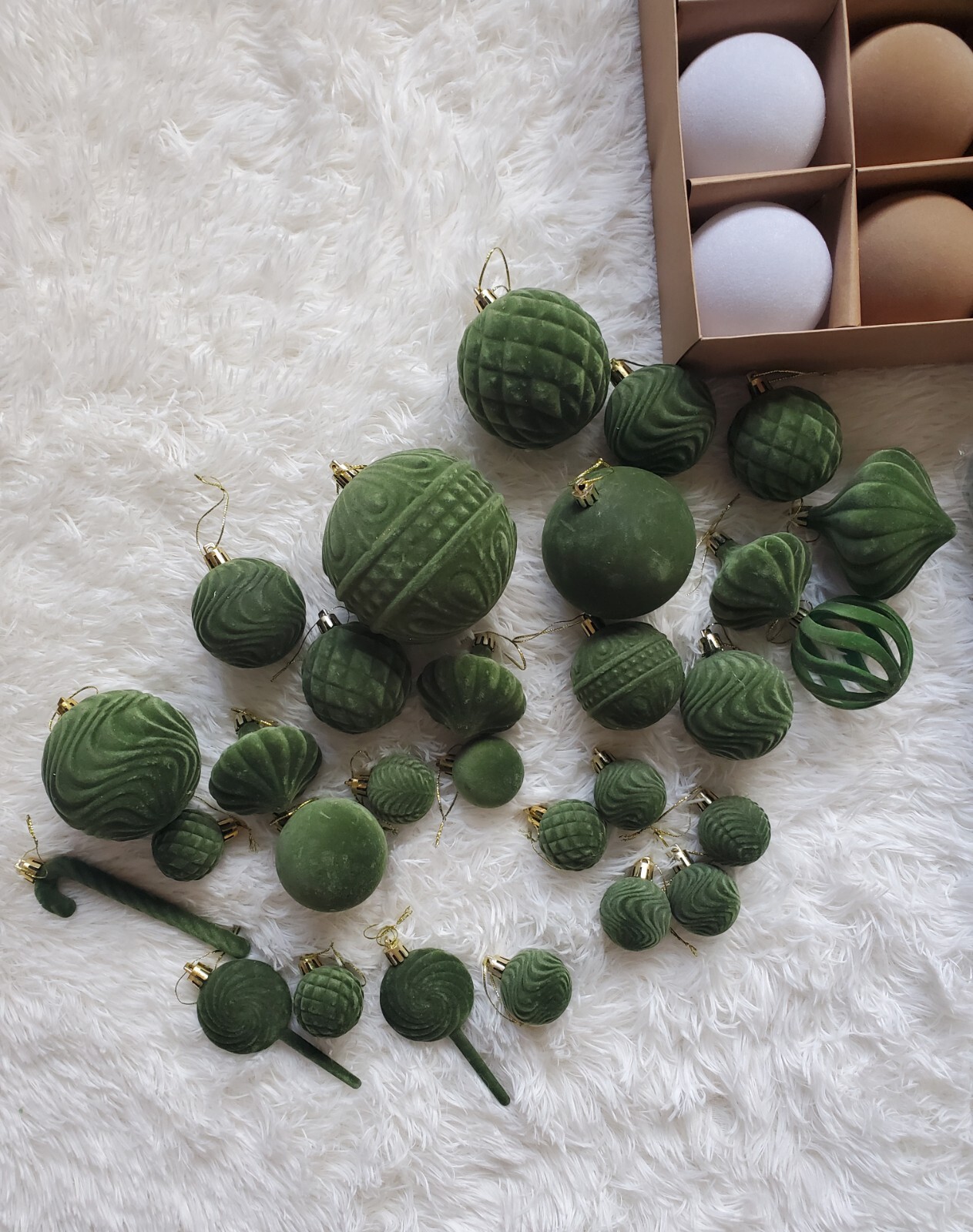 Enhance your holiday decor with this elegant, flocked velvet ornament set. Featuring a blend of green, brown, gold, copper and white colors, these ornaments add a festive touch to any home. Perfect for creating a warm and inviting atmosphere. 126 ornaments in total plus 4 - 25 yard spools of velvet ribbon.