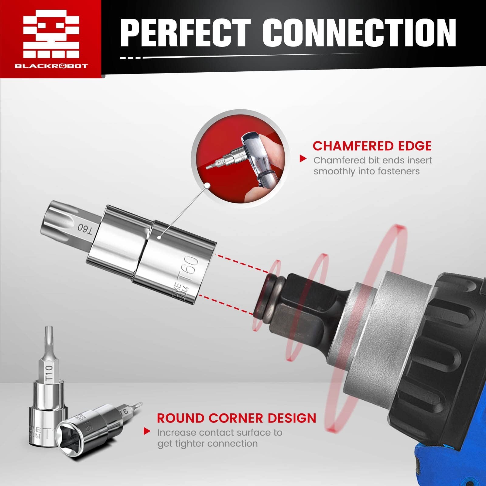 14-Piece Torx Bit Socket Set T6-T60, S2 and Cr-V Steel Star Bit Socket Set 1/4” 3/8” 1/2” Drive, T Torx Enhanced Storage Case for Motorcycle Bicycle Machinery Repair - Buy Now with Fast Shipping! 14-Piece Torx Bit Socket Set T6-T60, S2 and Cr-V Steel Star Bit Socket Set 1/4” 3/8” 1/2” Drive, T Torx Enhanced Storage Case for Motorcycle Bicycle Machinery Repair Product Details Brand: BLACKROBOT Item Length: 0.25 Inches Material: Chrome Vanadium Steel, S2 Steel Drive System: Torx, Star Finish Type: Chrome Plated,Corrosion-resistant,Mirror,Polished Brand: BLACKROBOT Item Length: 0.25 Inches Material: Chrome Vanadium Steel, S2 Steel Drive System: Torx, Star Finish Type: Chrome Plated,Corrosion-resistant,Mirror,Polished Number of Pieces: 14 Manufacturer: BLACKROBOT Part Number: Torx Bit Socket Set Item Weight: 1.46 pounds Country of Origin: China Item model number: Torx Bit Socket Set Size: 14PCS Torx Bit Set Finish: Chrome Plated,Corrosion-resistant,Mirror,Polished Item Package Quantity: 1 Compatible Fastener Range: 0.25 inches Batteries Included?: No Batteries Required?: No Date First Available: March 1, 2023 Key Features ✅ COMPREHENSIVE SET 14-piece Torx Bit Socket Set: 8pc 1/4" Bit sockets: T6, T8, T10, T15, T20, T25, T27, T30; 5pc 3/8" Bit Sockets: T40, T45, T47, T50, T55; 1 pc 1/2" Bit Sockets: T60;A plastic storage case. ✅ HIGH QUALITY The star bit socket set is made of high quality S2 alloy steel for superior hardness and to ensure long life, and the Cr-V steel sockets provides superior torque for greater rotational power. ✅ EASY TO IDENTIFY The surface of the torx bits both has large, clear size markings that are easy to read and won't wear out. Comes with a storage case for easy portability. Dimensions are also printed under each slot for easy identification! ✅ WIDE APPLICATION BLACKROBOT torx bit set includes all essential sizes, suitable for tasks related to bicycles, motorcycles, automobiles, appliances, lawn equipment, machinery, and any other jobs requiring star fasteners/bolts/E-sockets. ✅ OUR PROMISE At BLACKROBOT, we provide 1 year warranty and 24/7 Service. If you encounter any problems during use star bit set, please feel free to contact us. Product Description