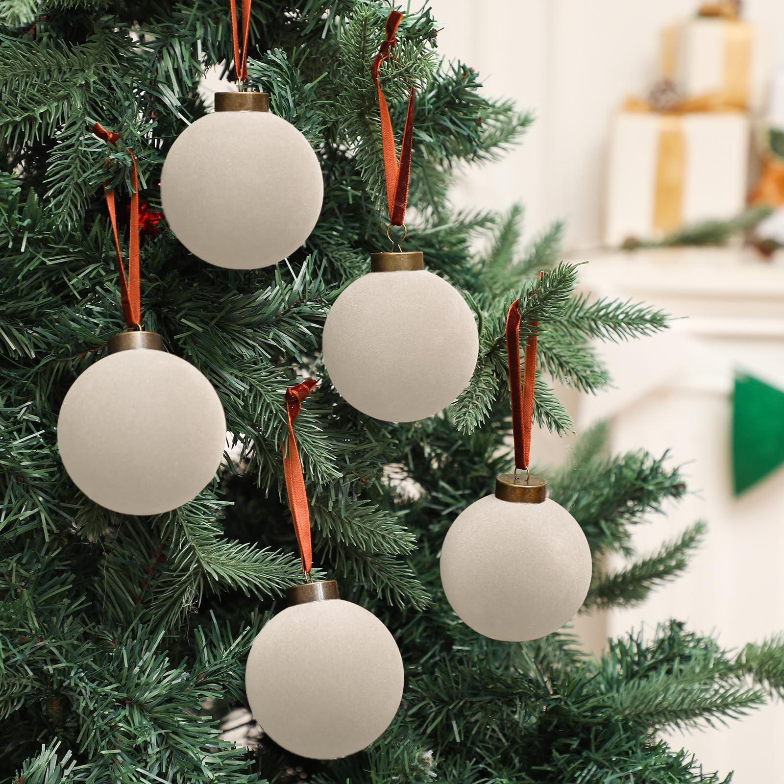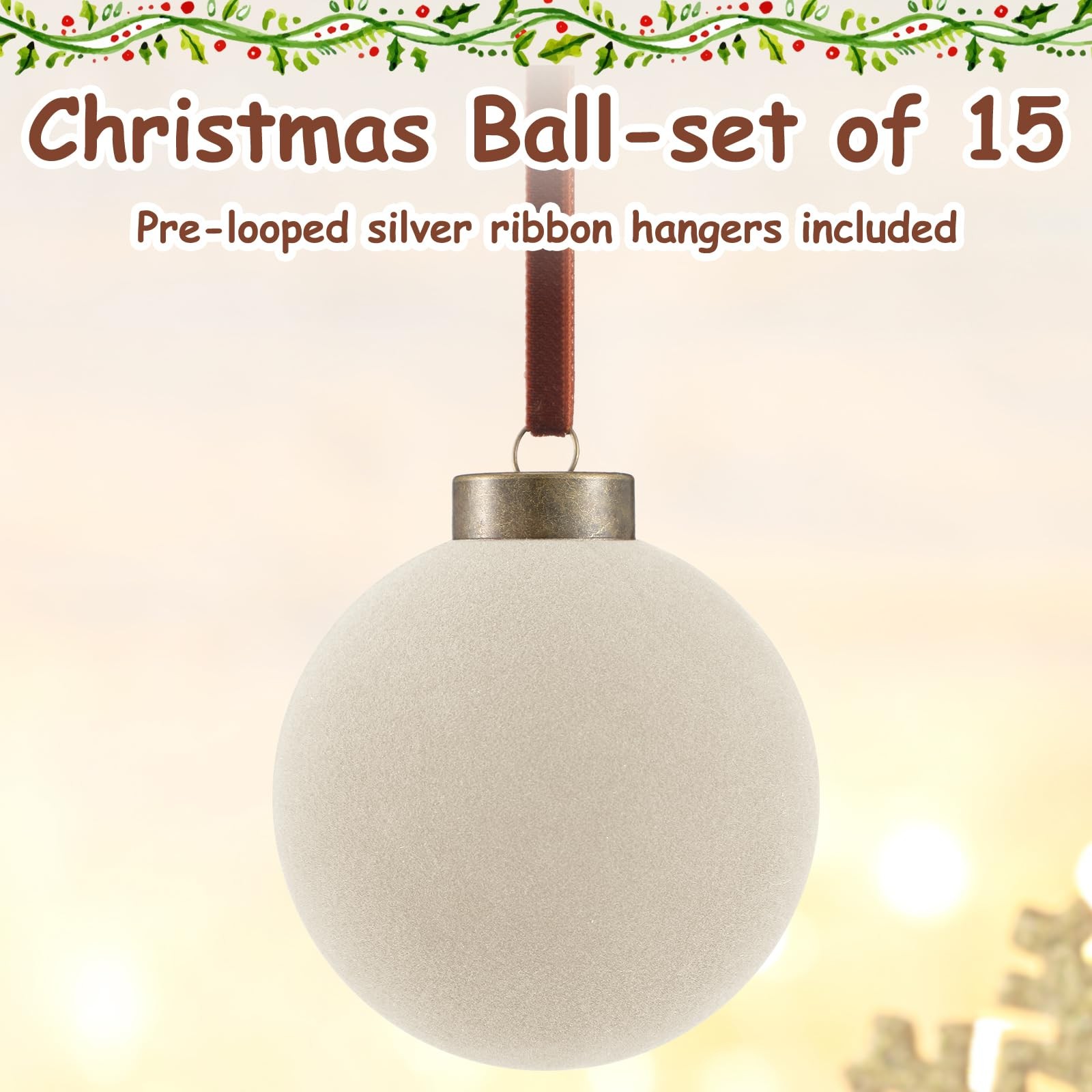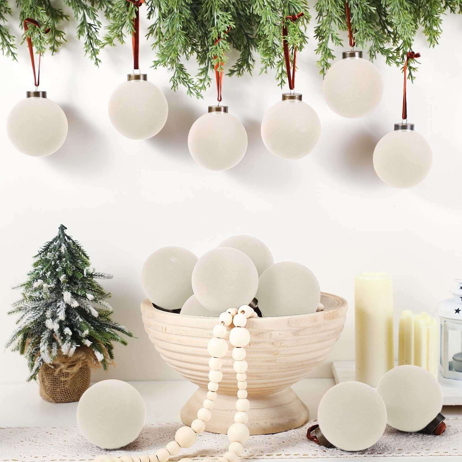 Package List: the package contains 15 pieces of flocked Christmas ball ornaments, measuring approx. 3.15 inches in diameter, featuring creamy white, sufficient quantity, classic styles, and nice texture can fully meet your needs for decorating and sharing Easy to Hang: the Christmas tree ornaments are equipped with a metal buckle and hanging rope, durable and reliable, easy to hang, offering functionality and aesthetics, eliminating the stress of sourcing for additional materials or tools to get your tree set up, adding a relaxing atmosphere to your house Flocked Design: the Christmas ornaments balls enjoy flocking texture, introducing a multidimensional appeal to your tree, scattering these Christmas hanging balls can create a retro and beautiful effect that stands out, transforming your home into a distinctive and elegant winter scene Reliable and Practical: the Christmas ornaments are mainly made of quality plastic, with a flocking texture, not easy to fade, deform, break, and wear out, easy to hold, suitable for long time use, enhancing the aesthetics of your Christmas tree and overall festive decor for many festive seasons to come Wide Occasions: the flocked Christmas tree ball isn't restricted to tree decorating, you can also apply the ball on doors, Christmas trees, windows, walls, and porch in your living room, bedroom, fireplace, and other places, ideal for birthdays, Halloween, Christmas, and other festivals, making the festive atmosphere of the holiday spread in every corner of your space