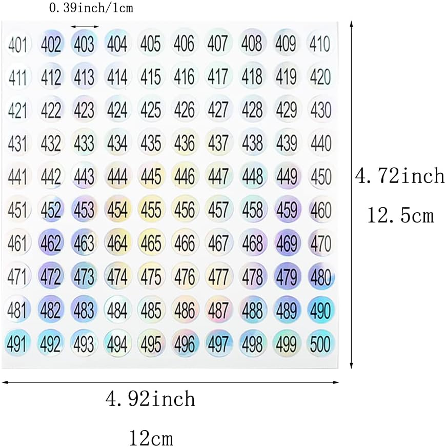 Store New Arrivals Add to Favorite View Feedback 15 Sheets Mini Number Stickers 1 to 500 round Labels Stickers Consecutive Number Stickers for DIY Marking Numbering Tool Description Item model number RQ-HBD029 Style Minimalist Number of Items 15 Pattern Number Material Type Vinyl, Paper Theme Number Surface Recommendation Paper Material Vinyl, Paper Cartoon Character Bubble Number of Pieces 15 Brand SaktopDeco Manufacturer Part Number RQ-HBD029 Age Range (Description) Kid Shape Round Unit Count 15.0 Count Finish Type Adhesive Package Dimensions 5 x 4.8 x 0.2 inches Manufacturer SaktopDeco Reusability Single Use Indoor/Outdoor Usage Indoor Water Resistance Level Not Water Resistant Item Weight 1.58 ounces Special Feature Self-adhesive Color Silver Black Item Form Sheet Recommended Uses For Product Paper, Wall, Mirror, Notebook, Backpack Size 4.92X4.72inch PACKAGE INCLUDED: 15 Small Number Stickers, including numbers 1-100, 101-200, 201-300, 301-400, 401-500, 3 for each sticker. PRODUCT SIZE: Tiny number stickers size approx. 0.39Inch/1 cm, The entire paper size is 4.92X4.72inch(12.5 x 12cm). PRODUCT MATERIAL: Made of vinyl. These small number stickers are self-adhesive and easy to stick or peel off. CONSECUTIVE NUMBER STICKERS PRODUCT DESCRIPTION: The clear and visible numbers on a silver background are black, making it easy for you to recognize them. NUMBERS STICKERS EXTENSIVE USE: You can use it anywhere you feel you need to mark it! Their surfaces reflect light, helping to quickly distinguish and locate items. 15 Sheets Mini Number Stickers 1 to 500 Self Adhesive Round Labels Stickers Consecutive Number Stickers for DIY Marking Numbering Tool by SaktopDeco Consecutive Number Stickers Product Description: Number 1 to 500 with self-adhesive stickers. Easy to stick or peel off Unlike ordinary stickers, these numbered stickers are designed to be highly recognizable, making them perfect for labeling inventory, personal items, and more. Numbered Stickers Applicable Various Scenes: Suitable for home, office, school, classroom, sports events, parties, convenient for you to recognize and organize things. Mini Number Stickers Contents: 15 Small Number Stickers, including numbers 1-100, 101-200, 201-300, 301-400, 401-500, 3 for each sticker. Number Labels Size: 0.39Inch/1 cm The entire paper size is 4.92X4.72inch(12.5 x 12cm) Consecutive Number Stickers Specification: Color: Silver Black Material: Vinyl Shape: Round KINDLY REMINDER: Please allow a little error on size due to the measurement by hands. Please double check the sizes before purchasing. Due to different lighting, colors may vary. Please understand. ABOUT US We offer the best prices around on high quality products. Our E-store includes media such as books, movies, music and games while offering electronics, toys, sporting apparel, clothing, tools, general home, garden items and more. SHIPPING We are always working hard to ensure your package arrives as soon as possible. Please understand that some factors like weather, high postal traffic, and the performance of shipping companies are outside of our control. We offer free shipping to the lower 48 states and ship within 2 business days of payment, usually sooner. We do not accept P.O. Boxes. Please provide a physical address. RETURNS We offer a 30-Day Return Policy on items which you are not completely satisfied with. You have the option for a full-refund or an exchange of the item. No returns are available on items shipped outside of the USA. PAYMENT We accept PayPal. CONTACT US This page content is yet to come Please ad us to your favorite seller and visit again later Thank You