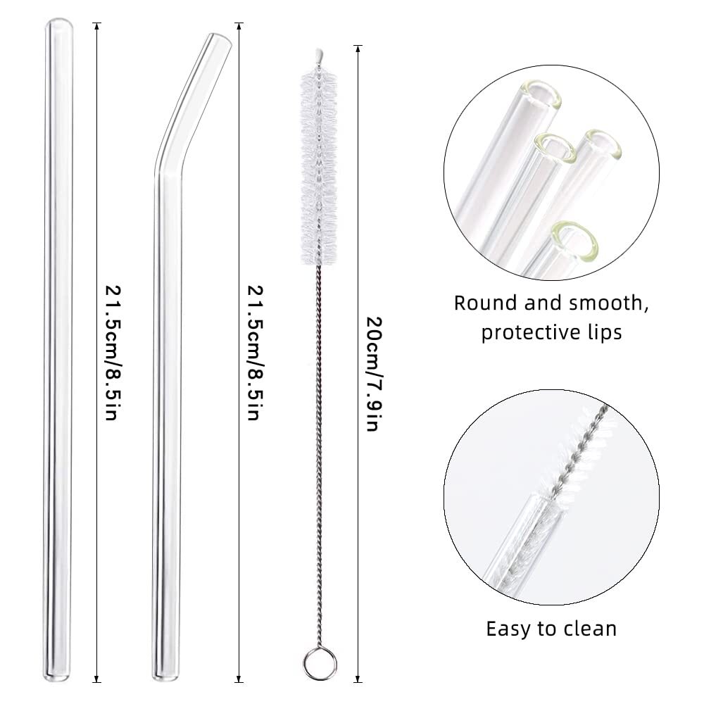 Straws Set- This kit includes 6 straight straws, 6 curved straws and 4 cleaning brushes. 1 cm diameter Our straws are a perfect replacement for plastic straws. PREMIUM GLASS STRAWS - BPA free, very robust, operating temperature: -40C° to +200C°. Glass straws can also be used as cocktail shakers. Reusable Premium Material - With 1.8mm thick glass, we made almost the thickest glass straws, which means longer service life and more safety for the old and the kids. THE STRONGEST GLASS STRAW - We use clear borosilicate glass to make our glass straws. Borosilicate has superior durability and is more shatterproof than other glasses. The colors remain brilliant after each use and wash. Additionally, borosilicate is microwave, oven, freezer and dishwasher safe! Easy to Clean: Easy to clean in a dishwasher or by the built in 4 straw brushes that easily penetrate the entire wall of the clear straw. straws are ideal for cold and hot beverages such as smoothies, lemonades, milkshakes, water, coffee, hot/iced tea, milk and cocktails, hot chocolate and juices Suitable for Gifting - a good gift for your family and friends: you can send it to family or friends as a gift, they will like it very much.