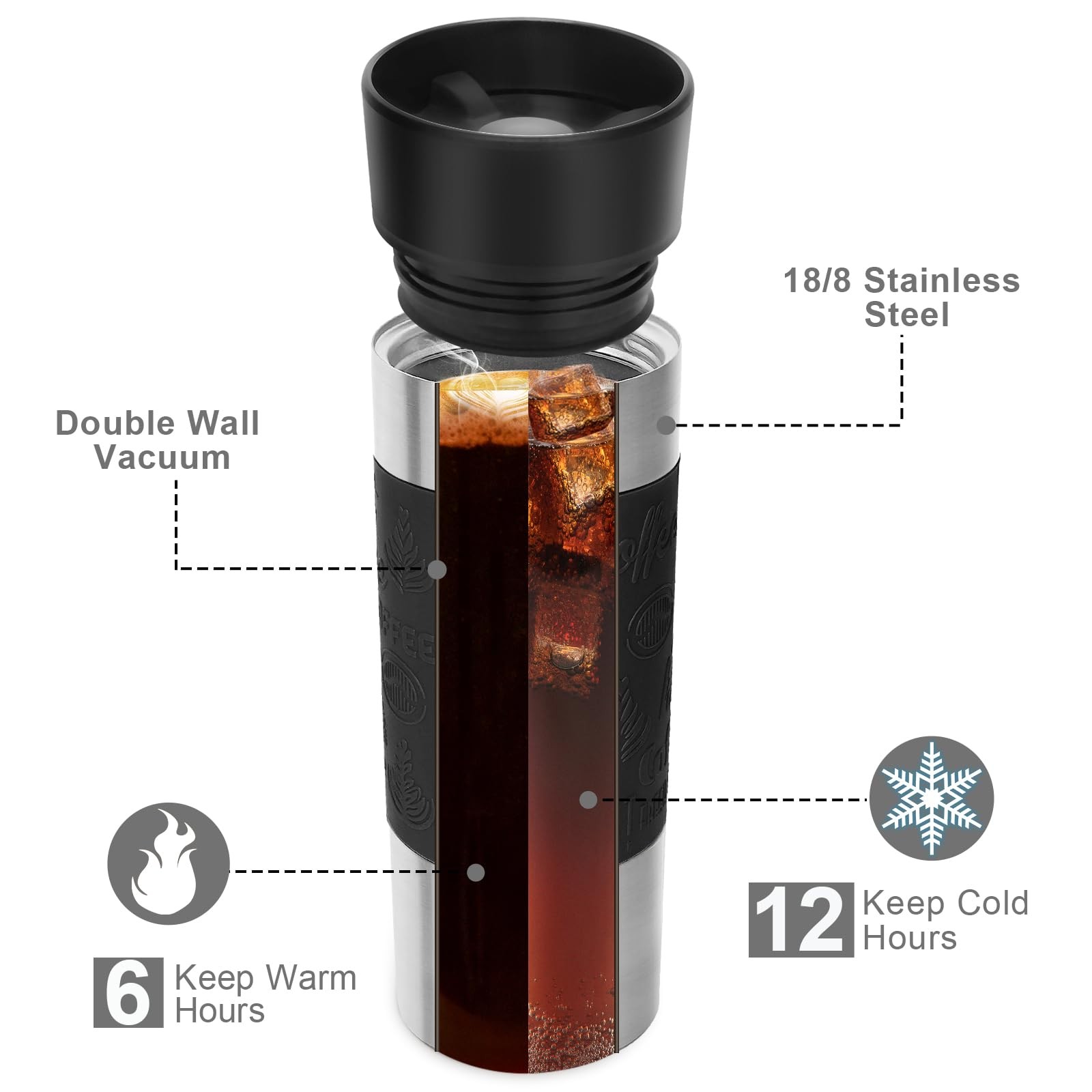 Vibrant-color Travel Coffee Mug with 360°Drinking Lid With various stylish and colorful designs, we coffee travel mug has a few colors and capacities to offer, suiting your different needs for various outdoor or indoor activities like work, drive, study, gym, have a picnic, camping, hiking, etc. Insulated Tumblers Suits Different Scenes has been deeply engaged in the design, development and production of thermal coffee mug technology for more than 10 years, becoming your reliable companion on your long journeys and great adventures in your everyday life no matter when you work, drive, study, gym, have a picnic, camping, hiking or any other activities, For the sake of the environmental protection, let us leave disposable paper or plastic cups behind, Enjoy your hot or cold drinks while contributing to the world's environmental protection. Quality 18/8 Stainless Steel Tumbler Well made of durable 18/8 Stainless Steel, our insulated coffee mug is free of harmful substances, odorless and tasteless, which is no health risk at all, keeping your drinks fresh and tasty originally while keeping your family free of safety worries. Coffee Mug with 360°Drinking Removable Screw-on Lid Removable lid makes clean up easier, One-click lid button makes one-handed a breeze, 360°all-round drinking outlet makes drinking more convenient, A screw-on mug lid design ensures our thermal coffee mug Leak Proof & Spill proof. Non-slip Silicone-Sleeve Coffee Cup Body Design our stainless steel coffee mug is designed with a silicone sleeve on coffee mug body, which makes it easy to hold and grip the coffee bottle even with your gloves or with your hands wet! Non-slip Silicone Stainless Steel Tumbler Bottom Design Covered with a non-slip silicone bottom, our coffee travel mug will not easy to slide down from 【Easy to Drink with 360°Drinking Outlet】- Easily Using ONE finger to press on the button at the top of travel coffee mug, you can drink your water from all sides, which makes drinking one-handed a breeze, without worry of looking for the drinking outlet when busy on driving or any other things. 【Keeps Drinks Cold or Hot】- Applying excellent quality Double Wall Vacuum 18/8 stainless steel, this insulated coffee travel mug will keep your drinks cold for 12 hours or hot for 6 hours, terrific thermal coffee mug for your way out for trip, work or libary, etc, meanwhile, 18/8 stainless steel mug ensures a lasting-favor of drinkns with no peculiar smell. 【Travel Coffee Mug Spill Proof & Leak Proof】- Well made in sealing of mugs lid, this insulated coffee mug will keep your water, coffee, tea or other drinks on lock, no worry about liquids spill or leak when using. Also, coffee mugs are made of Food Grade BPA-Free material, without any worry of safe problem. 【Easy Cleaning with Dishwasher Safe】- Insulated coffee mugs are dishwasher safe material, which frees your hands by tossing travel coffee mug in dishwasher without worry of finish flaking. Please note that the plastic lid can not be put in dishwasher, but removable top lid of coffee mug makes hand wash clean up more easily. 【Easy to Hold with Non-Slip Silicone】- Designed with non-slip silicone cover and ruber cushion on bottom of coffee mug, you can easily hold this travel mug without worry of slippery and tough to hold onto with wet hands or with gloves. Also with its right size you can perfectly put in your car cup holder, at your coffee maker, or anywhere you want to take and use like home, gym, library, travel or any outdoor indoor activities!