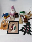 17 Assorted Wooden Christmas Ornaments Bears Trees Birds Hand Painted Carousel The set includes a yellow cat, a card "Happy Holidays", a Tree with bells, a bear with articulating arms and legs, a doll, a house, an elephant on a cart with wheels, A Santa , a house, a barber shop, a bear in a carriage, a penguin, a carousel with carolers, an egg, a red bird, a hand painted ball, and an anchor "1995". Thank you for shopping with me. Please see photos for exact details of the item and please feel free to contact me for more information or for additional measurements. Very quick shipping, same day or next day. Liz at Blackberry Morning Resellers