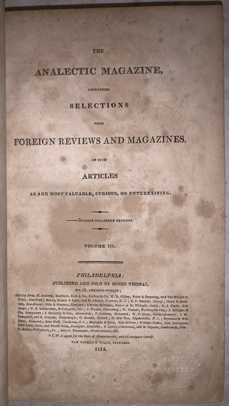 The Analectic Magazine, Containing Selections from Foreign Reviews and Magazines, of Such Articles as are Most Valuable, Curious, or Entertaining Volume III - January-June Philadelphia: Moses Thomas 1814 First Edition Octavo, ii, 528 pages, rebound in gilt lettered grey cloth covered boards. There is a stamp and a few markings indicating that this item originated from an institutional collection. Some rubbing and wear, foxing and discoloration, else in good + condition. If you have any questions, feel free to ask, and don't forget to check out my other listings.