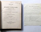 1869 FILTRATION OF RIVER WATERS FOR THE SUPPLY OF CITIES AS PRACTISED IN EUROPE, by James P. Kirkwood. Published by D. Van Nostrand, Publishers, New York, 1869. First Edition. Copy of HIRAM BISSELL who was President of HARTFORD'S WATER COMMISSION from 1854 to 1873 and OVERSAW THE CONSTRUCTION OF HARTFORD'S WATER WORKS SYSTEM. The book is SIGNED by Hiram Bissell at the top of the title page: "Hiram Bissell / Hartford, Conn." Also, laid-in the book is a MANUSCRIPT LETTER by Hiram Bissell on "Office of Water Commissioners" letterhead. The letter reads in part: "Hartford Jany 28 1856 / To the Mayor Aldermen, and County of Common Council of The City of Hartford / The Water Commissioners...recommend to the Hon. Court of Common Council the payment of The Woodruff & Beach Iron Works bill of extras...$3851.57. / Respectfully Submitted / Hiram Bissell / President Pro Tem". (Woodruff & Beach Iron Works of Hartford built many items for Hartford Water Works, including some massive iron pumps.) Hardcover book, 9x11.5 inches, 178 pages of text followed by 30 PLATES, many double-page, one in color. The plates are drawings of a variety of European city water works systems, including: London, Liverpool, Dublin, Hamburg, Berlin, Marselles, Lyons, Genoa, and others. Condition: The covers are disbound (loose but present), the cloth spine edges and spine ends are scraped and chipped, nonetheless the covers are original. Internally nice, the endpapers have a few small scrapes, the pages are lightly toned, there is some foxing to the plates mainly on their blank backsides, overall the pages are complete, tight, bright, clean and unmarked. A nice, complete copy in disbound but present covers. RARE TRUE 1869 FIRST EDITION with all the PLATES. Unique with the SIGNATURE and LETTER of HIRAM BISSELL, who oversaw the construction of Hartford's Water Works in the mid 1800s. An important book that may have been partly responsible for the design of Hartford's water system About HIRAM BISSELL of HARTFORD, CONNECTICUT (from "Water for Hartford: The Story of the Hartford Water Works", published by the Wesleyan Press, 2010). ******HOW THREE MEN BROUGHT CLEAN WATER TO HARTFORD, ON A MASSIVE SCALE. As good health is inextricably wedded to pure drinking water, understanding delivery systems is almost as important as the water itself. Water for Hartford chronicles the century-long effort, beginning in the 1850s, to construct a viable, efficient water system. The story of Hartford's water works is a fascinating one, for it recalls the hard work, great sacrifice, and extraordinary engineering feats necessary to deliver wholesome drinking water to a growing urban center. The story of its construction is the story of three men - HIRAM BISSELL, Ezra Clark, and Caleb Saville. Readers are transported back in time and given a firsthand glimpse of what these champions of a water system faced on a daily basis: unforgiving geography, venal politicians, and an often indifferent public. The book culminates in the exhilaration of these men having built a water works from scratch to deliver clean, safe drinking water to the masses. These men understood that their decisions and actions would affect millions of people for decades to come.****** About HIRAM BISSELL and the HARTFORD WATER WORKS SYSTEM (from the Commemorative Biographical Record of Hartford County, Connecticut, published 1901): ******Hiram Bissell, b.1819 d.1888, was elected Water Commissioner in 1854 and, in 1856, was made President, in which capacity he served for seventeen years, retiring in 1873. He oversaw the entire system of Hartford's system of water works.******