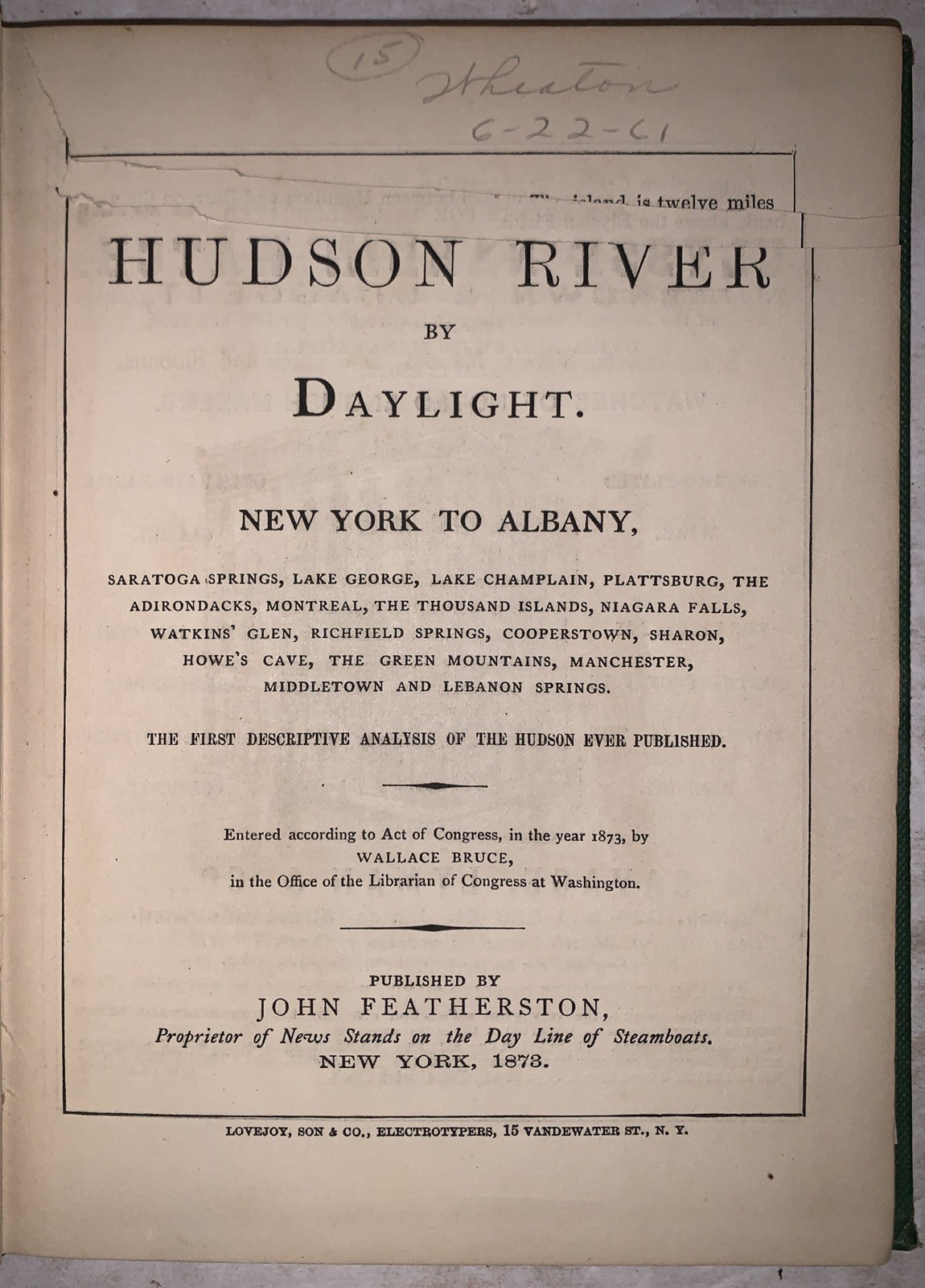 The Hudson River by Daylight New York to Albany, Saratoga Springs, Lake George, Lake Champlain, Plattsburg, The Adirondacks, Montreal, The Thousand Islands, Niagra Falls, Watkins' Glen, Richfield Springs, Cooperstown, Sharon, Howe's Cave, The Green Mountains, Manchester, Middletown and Lebanon Springs The First Descriptive Analysis of the Hudson Ever Published New York: John Featherston 1873 First Edition, Expanded Issue 12mo, 135 pages plus 23 pages of adverts, publisher's original gilt lettered green cloth covered boards. Illustrated with numerous black-and-white illustrations and with a large folding color lithographic map of the Hudson River at rear. The top margin of the title and adjacent leaf clipped, some slight rubbing, minimal discoloration, else in good + condition. A richly illustrated 19th-century guidebook and souvenir, issued for passengers aboard the Hudson River Day Line steamers. The work combines descriptive text and local history with vivid engravings of river towns, resorts, and landmarks, offering a romantic view of the Hudson Valley at the height of its fame as both a scenic wonder and a fashionable resort corridor. The folding map provides a colorful overview of the river’s course and is rarely found intact. An especially attractive survival of this important Hudson River guide in its full, expanded form. If you have any questions, feel free to ask, and don't forget to check out my other listings.