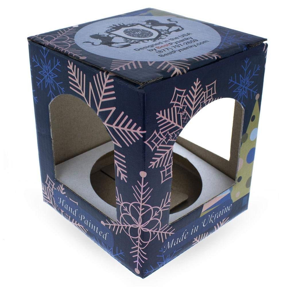 -Diameter: 4 Inches (10 cm) -Material: Crafted from German Glass -Creation Method: Mouth Blown and Hand Painted -Finish: Detailed with Italian Paint -Accent: Enhanced with a Colorful Ribbon for Hanging -Design: Styled in the USA -Manufacturing: Skillfully Produced in Ukraine -Packaging: Presented in a Vibrant Colorful Gift Box Indulge in the elegance of our exceptional holiday decorations collection from , crafted to adorn your home with exquisite style, refinement, and a dash of enchantment. The mastery of talented Ukrainian artisans, the use of high-quality German glass, and our original design concepts all contribute to the robustness and allure of these luxury tree ornaments. This skilled craftsmanship is a testament to the beauty and durability of our pieces. To further enhance their appeal, each ornament is fitted with a vibrant ribbon, allowing for easy placement on the tree or any desired location. Our ornaments' intricate hand-painted details reflect the ingenuity and adeptness of Ukraine's finest craftspeople. With the employment of traditional and authentic crafting techniques, these ornaments stand as genuine art pieces, destined to enchant many generations. Adding a touch of sophistication to your holiday gifting, each ornament is tastefully packaged in a vibrant gift box. Whether you are embellishing your own tree or in search of a distinguished gift, our glass ornaments are designed to infuse your holiday season with a gentle sparkle and an air of luxury. Experience the charm and quality of our collection, and let it be a timeless addition to your festive decor. 4 Inches in Diameter (10 cm) German Glass, Italian Paint Hand Painted Hanging Ribbon Attached, Gift Boxed Made in Ukraine