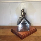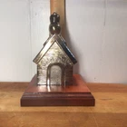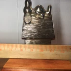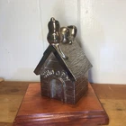 The product is a vintage 1958 Peanuts Snoopy on Dog House coin bank made of silver-plated metal. It features the beloved character Snoopy from the Peanuts franchise, standing on a dog house. The item measures 3.75 inches in length, 6 inches in height, and 3.25 inches in width. It was manufactured in the United States in 1988 and is part of the Peanuts TV show and animation theme.
