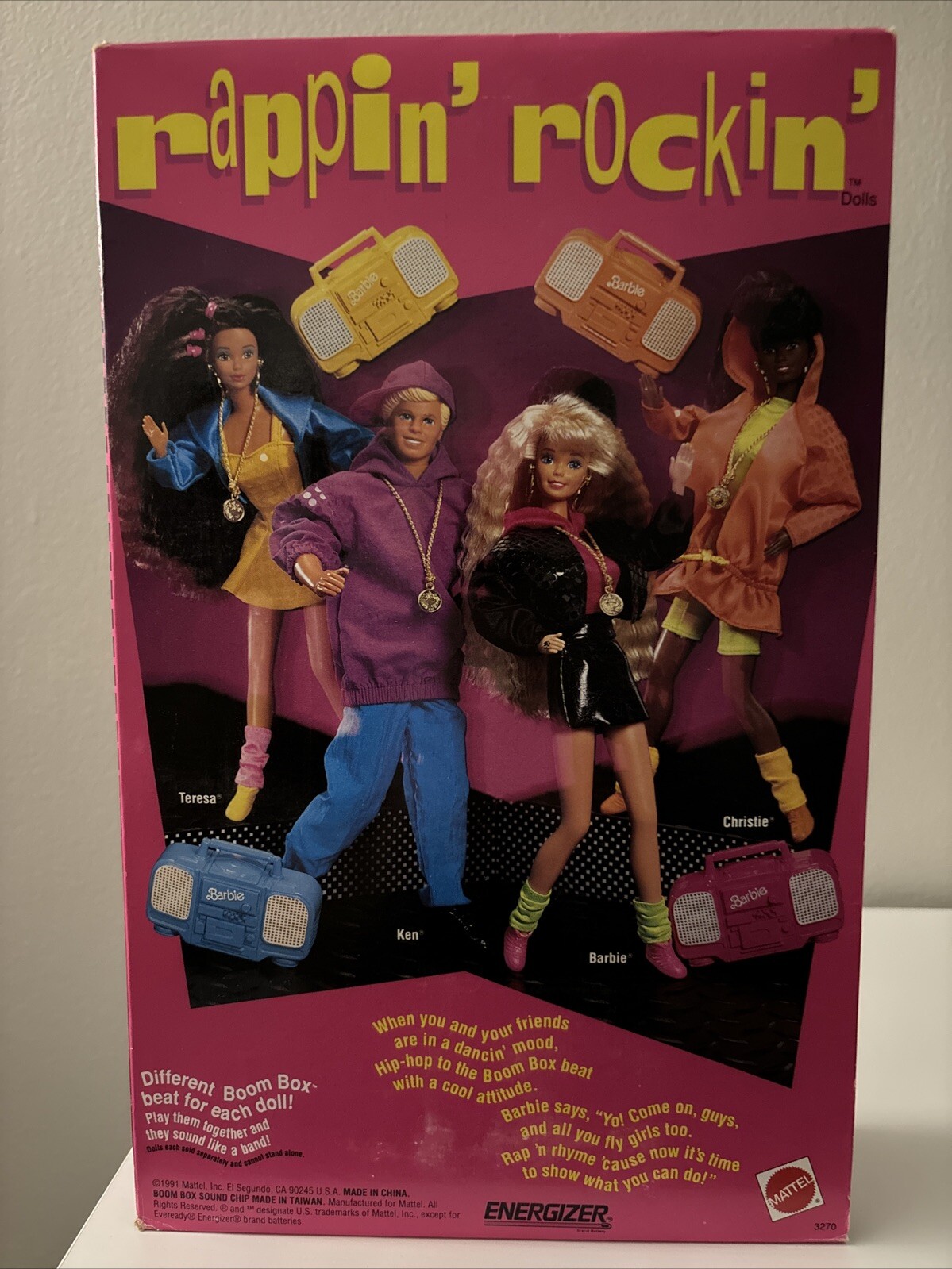 1991 Barbie Rappin Rockin Teresa YO! Boom Box #3270 by Mattel is a vintage Rocker Barbie doll featuring Teresa with wavy hair, brown eyes, and bendable limbs. She comes in her original packaging with a boom box accessory. This 11.5" fashion doll is part of the Rocker Barbie franchise and was manufactured in 1991. The doll is a Hispanic/Latino girl doll made of vinyl, plastic, and fabric. It is a collector toy with battery-operated features.