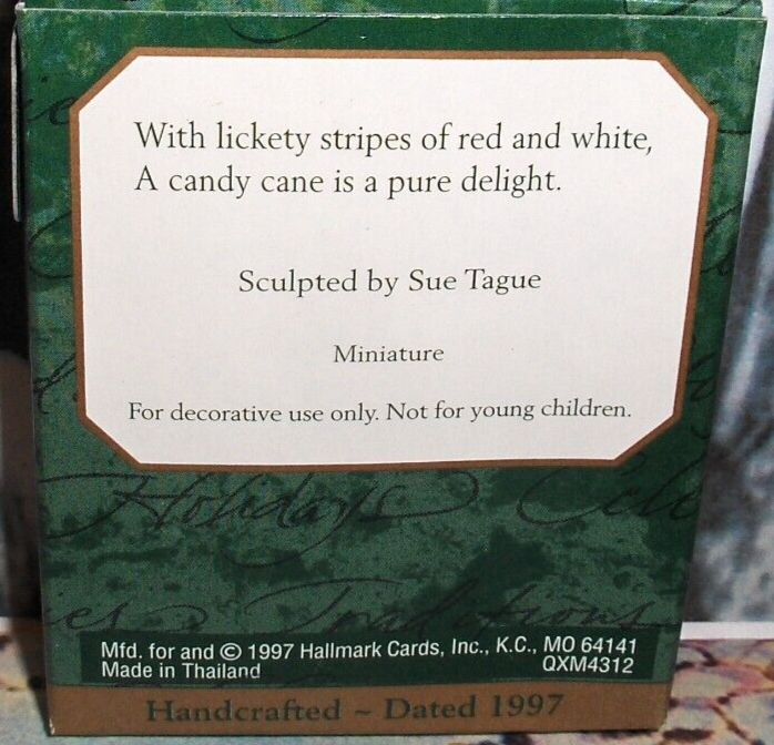 We Have For Sale A USED-Approx 1 Inch-> Miniature Hallmark Tree Ornament.. ( 1 ) Hallmark Ornament / With Lickety Stripes Of Red And White,A Candy Cane Is Oure Delight.. ( 2 ) Type / Peppermint Painter Ornament.. ( 3 ) Collector's / Make This Little Peppermint Licking Cutie Part Of Your Holiday Mini Tree Decorations ... ( 4 ) Year / 1997 ( 5 ) Lighted / None, ( 6 ) Box Condition / Box Is Very Nice-Look At Pictures..Check Out Our Many Other Hallmarks In Our EBAY STORE.. ( 7 ) Ornament Condition / Mint In It's Box.. ( 8 ) Org Price Tag Intact / Yes SHIPPING WITH TRACKING IS FREE TO THE USA... -->>ALL OUR ORNAMENTS SHIP TO YOU IN BRAND NEW BOXES-NOT ENVELOPES OR SOMEONE ELSE'S SECOND HANDED USED BOXES-STAY SAFE...