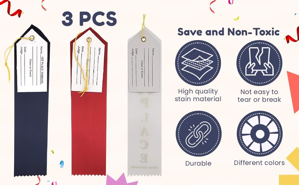 These ribbons are perfect for any competition or event! The colors are vibrant, and the quality is great—they look and feel premium. Each pack has plenty for multiple winners, and the included event cards are a nice touch. Easy to hang with the strings, and the size is just right. Highly recommend for schools, contests, or parties!