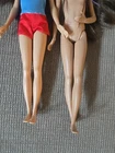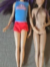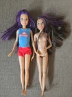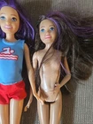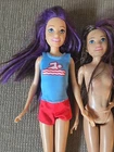 Two Mattel Barbie Skipper dolls with purple streaks on their bodies, manufactured in 2013. The set includes two dolls dressed in fashion attire. The Skipper dolls have straight doll hair, blue eyes, and a light complexion. They are part of the Barbie franchise and were made during the time period of 2010-2019. The dolls are original and designed as girl dolls.