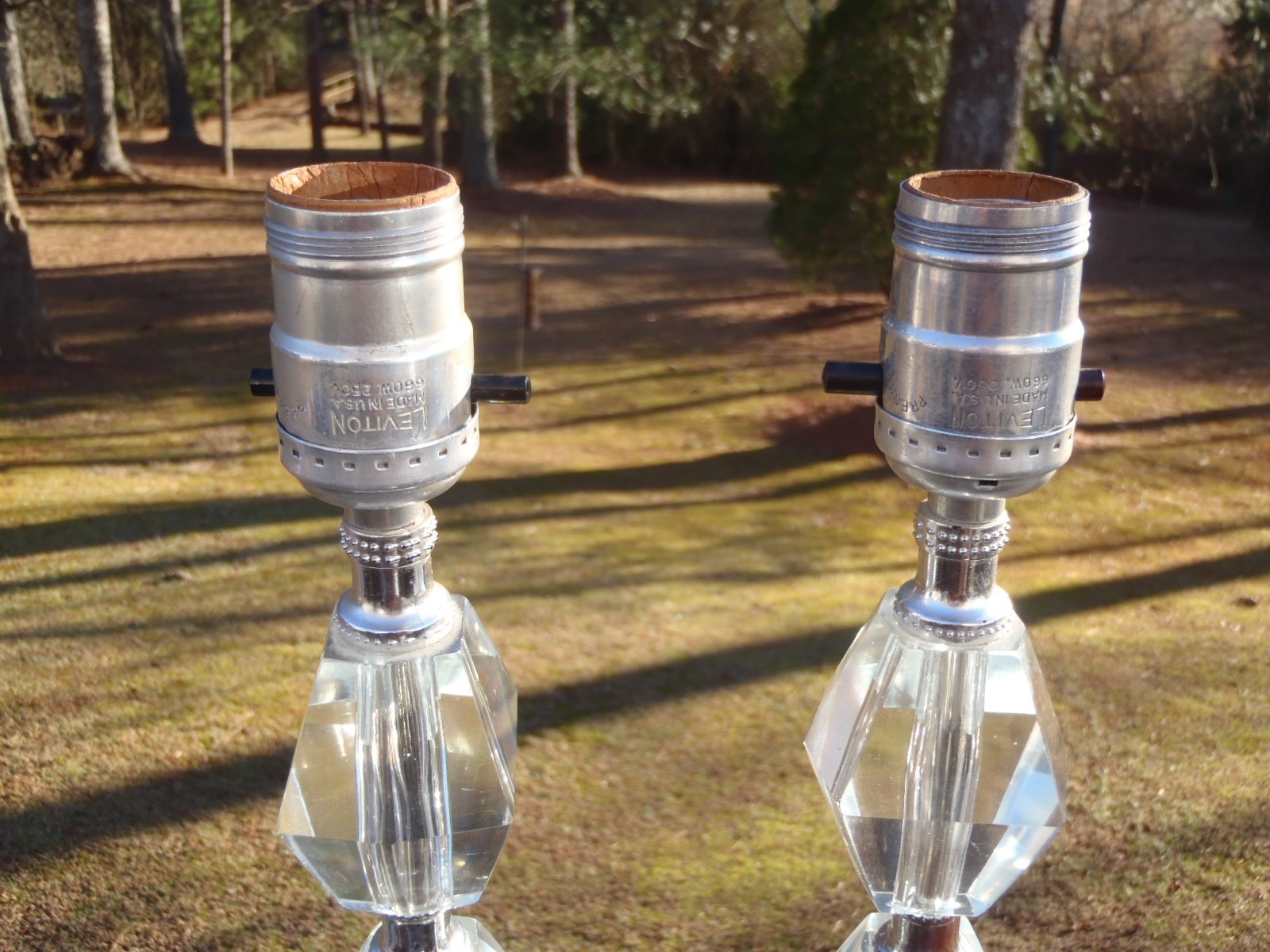 Up for bid here is a vintage pair of mid century art deco clear acrylic/lucite and glass 3 tier electric boudoir dresser table lamps, ca 1950s-1960s. These as came out of an Estate, but the maker and exact age is not known. These lamps are in very good p re-owned working condition with minimal surface patina/use and no chips or cracks. The lamps are tiered and the top two tiers are made of thick clear acrylic or lucite, silver color spacers, and the bases are clear thick glass. Each lamp measures approx. 12" tall by 3 1/2" square at the base. Each lamp also has an approx. 60" long electrical cord with plug in. Folks, this is a lovely Art deco pair of electric boudoir dresser table lamps and it they would go wonderful in a collection or home. U SPS Ground/Parcel and FedEx Ground/Home Delivery mail true calculated shipping costs is based on a insured well wrapped and packed 7 lb shipment, box size 16Lx9Wx7H. If you would like to see the all the available shipping services with calculated shipping costs, please look under the Shipping & Payments tab above the Item Specifics on our auction page or scroll down to the Shipping, returns & payments section and hit the small arrow on the right of Returns, thanks. NO WORRIES ... YOU CAN BID HERE IN CONFIDENCE! We are a true U.S. seller, NOT a drop shipper and item ships from our U.S. location! As always ... Low Opening Bid and Never a Reserve! Plus, we NEVER end an auction early or CANCEL a bid after the auction has ended! PLEASE BID ONLY IF YOU ARE SERIOUS and INTEND TO PAY IF YOU ARE THE SUCCESSFUL WINNER! Our quality merchandise come directly from Estate Sales, private homes, thrift shops, and local auctions hand picked and purchased by my husband and me. As most of you may know, most vintage or used items will have some age and/or wear, and here we like to describe as accurate as possible and show many photos, so you know exactly what you are bidding on. We are human and do make mistakes, but we honestly try very hard not to here so please rest assure and bid in confidence. Typically, our photos are shot outdoors under natural lighting on a not so fancy old railroad tie, rail, against our home, or somewhere outdoors, so please excuse any camera reflection glares, white spots or specks and shadows. Yes, we are old school and our descriptions also may be more lengthy than others, but we like you know exactly what you are buying/bidding on so there are no surprises. Please read the entire description, see all photos and ask any questions before placing a bid. All emails/messages are answered. We are rural and ship by USPS Ground/Priority and FedEx Ground/Home Delivery (true calculated shipping) and (free shipping) for local pick-up. We also recycle and use over-sized boxes and new high quality packaging materials to ensure your item(s) will arrive to you safe and unharmed. We do not charge for boxes, packaging materials, gas, or handling. We do not profit any money from shipping costs or sales tax. You are only charged true actual calculated postage and all items are shipped fully insured with carrier. We ship same or next day unless it is a holiday or a weekend, then shipment will be the following business work day. Payment is due within 3 days of close of auction, unless you have made prior arrangements with us. Please bid only if you are serious and intend to pay within the allotted time frame. North Carolina buyer must pay 7% sales tax. We combine shipping to save you money and give shipping discounts on 3 or more auction wins. The eBay combined shipping calculator is not always correct, so if you win 2 or more auctions please request or wait for a combined invoice for appropriate total. Our items come from a smoke free home. We do have many pets, but all items are stored in a pet free environment until delivery day. Claims/Refunds - Please DO NOT request a return on merchandise damaged in shipping. Insurance claims can only be filed upon proof of damage (proof of damage is pictures which are most needed to file claims) and before issuing you a refund. So if your item happens to arrive to you damaged in shipping, please contact us and DO NOT THROW ANYTHING AWAY. In order to file a USPS/FedEx online claim, we must have pictures of the shipping box at every angle, shipping labels (tracking/addressee), bubble wrap, wrapping/packing materials (packing/partitions), and of course the breakage. Once we receive all the requested pictures, we can send you a full refund ASAP. If there is a problem with your order, simply contact us. As an old-school eBay Seller, we list in the spirit in which eBay was founded; a place to find vintage, unusual, rare, hard-to-find, one-of-a-kind, and various quality items at affordable prices, for you! SHOP, BID and BUY IN CONFIDENCE! SATISFACTION GUARANTEED! Please, no buyer's remorse and ask any questions before placing a bid. We have been auctioning on eBay for 26+ years and truly only want the very best for you and us both. We honestly describe all our items to the best of our knowledge and ability and show many photos, but if you have a question(s) or just need further info. or pictures, please let us know. We don't just want you satisfied; we want you to be a happy returning customer for years to come! ;) THIS IS A 10 DAY AUCTION and HIGHEST BID WINS! THANK YOU FOR LOOKING and GOOD LUCK IF YOU BID! TAKE CARE and HAVE A BLESSED DAY!