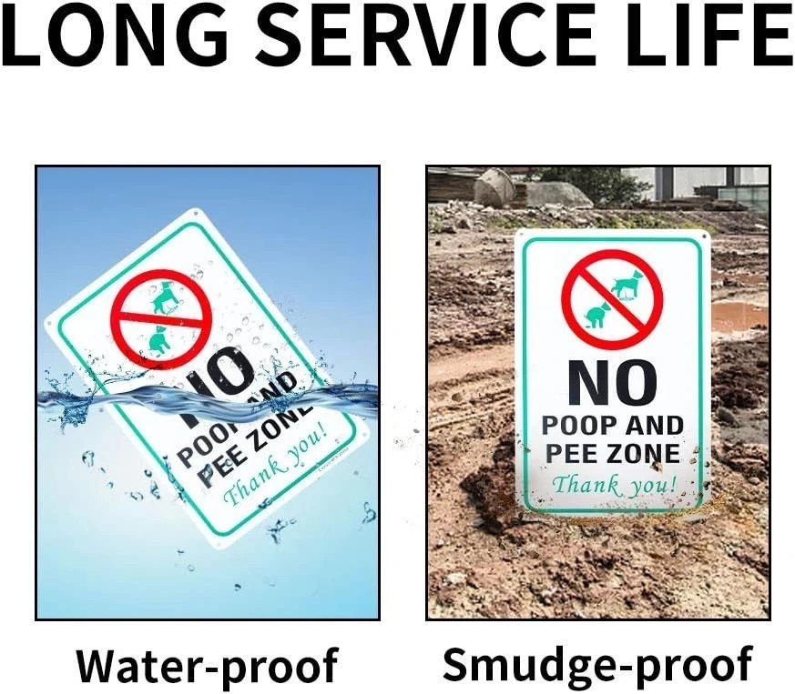 2 Pack No Pee and Poop Zone Dog Yard Sign, 12"x 8" .04" Aluminum Reflective Sign This sign is made out of .040 rust free heavy duty aluminum Reflective: Signs have good reflectivity that makes sure they can be spotted at night. With UV fade resistance ink and is weatherproof for indoor/outdoor use. Long Lifespan: Graphics and paint will withstand the outdoor elements and will not fade Easy Installtion: 6 Pre-drilled holes for easier installtion and Rounded corners design.