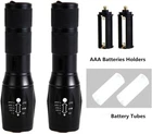 Super Bright with 5 Modes - Powerful high Lumen LED generates a brilliant large area floodlight or a perfectly focused spotlight over a beam distance of 656ft/200m. Adjustable focus with 5 modes: (High, Medium, Low, Strobe, SOS/Emergency). Adjustable Focus - Adjustable focus for use in different situations (just rotate the flashlight head to adjust). The LED flashlight allows you to select focus between spot and flood beams. Waterproof & High Quality - The flashlight is waterproof and is made of aluminum alloy and rubber. Durable aluminum alloy crust, abrasion resistance. Widely Used - Easy to carry with you as a backup and is small enough to fit in your pocket, handbag, drawer, or car compartment. Takes 3 standard AAA or a single rechargeable. No Lithium Batteries are included. What You Will Get: 2 x LED Flashlights, 2 x Battery Tubes, 2 x AAA Battery Holders (Batteries are not Included), and 2 x Lanyards (Hand Straps). Features: - Body material: aluminum alloy - Light source: LED bulb - Mode arrangement: high>medium>low>strobe>SOS - Reflector: aluminum reflector - Switch position: on the tail cover - Switch type: push button switch - Needed battery type: 3*AAA battery (Not included) or 1*single rechargeable battery (Not included) - Water-resistant design, small size, and easy to carry - especially suitable for outdoor activities such as camping and hiking. How to change the flashlight mode? There are 5 operating modes: high/medium/low/strobe/SOS. At the first click, the light is on the full brightness- high mode, lightly press down the rear button and release it to change modes, and fully press it to turn off the light. What You Get: 2 x LED flashlights; 2 x Battery Tubes; 2 x AAA Battery Holders (Batteries are Not included); 2 x Lanyards (Hand Straps) Description of the Issue - can desribe the product exactly