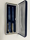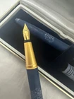 This exquisite vintage fountain pen holder, branded by the iconic Burj Al Arab in Dubai, is a must-have for collectors and pen enthusiasts. Known for its association with one of the world’s most luxurious hotels, this pen embodies elegance and sophistication. Crafted in Germany, it boasts a sleek blue design with gold chrome trim, making it a striking addition to any desk or collection. The medium-sized stainless steel nib ensures smooth, everyday writing, while the refined styling reflects the timeless prestige of the Burj Al Arab. Whether you're a passionate collector or simply seeking a distinguished piece for your writing experience, this fountain pen holder will certainly elevate your collection. Both pens have never been used, and come in original package.