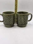 This product is a set of two vintage Mid-Century Modern stackable green coffee mugs made in Japan. These mugs are unique for their color and stackable feature, making them a collectible item for those interested in retro kitchen and home decor. The green hue adds a pop of color to any kitchen or dining area, while the stackable design allows for easy storage and organization. Made in Japan, these mugs showcase a quality craftsmanship and attention to detail that is characteristic of vintage kitchenware.