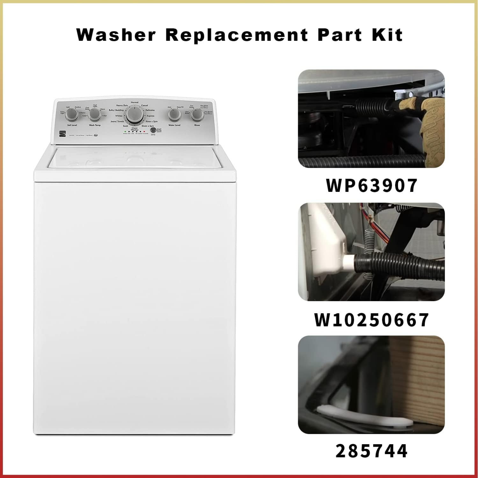 Description: ALL-IN-ONE WASHING MACHINE REPAIR KIT This high-quality washing machine kit includes: 3 pcs Suspension Springs (WP63907) 1 pcs Counterweight Counter Balance (W10250667) 3 pcs Base Pads (WP285744) Perfect for replacing worn or damaged parts in Kenmore and Whirlpool washers. COMPATIBLE PART NUMBERS WP63907 (AP6010168): Replaces 63907, 63907D, 671098, PS11743345, EAP11743345, PD00002622, etc. W10250667 (AP6017818): Replaces WPW10250667, 1549326, AH2363196, PS11751118, etc. 285744 (AP3094518): Replaces AP3094518, PS334620, 285220, 285744VP, AH334620, etc. SAVE TIME & MONEY Each component is thoroughly tested for quality and durability. This kit helps you fix common washer issues at a fraction of the cost of hiring a repair service. FITS MULTIPLE MODELS Compatible with Whirlpool and Kenmore washer models, including: 11010202000, 11010502990, 11013202200, 11014112300, 11015842400, 11016102500, and many more. COMMON REPAIR SYMPTOMS Washer vibrating excessively Tub off balance or slamming into the washer body during spin cycles Shaking, moving, or making unusual noises DURABLE & RELIABLE Crafted from premium materials, this repair kit is designed to extend the lifespan of your washer while ensuring smooth and quiet operation.