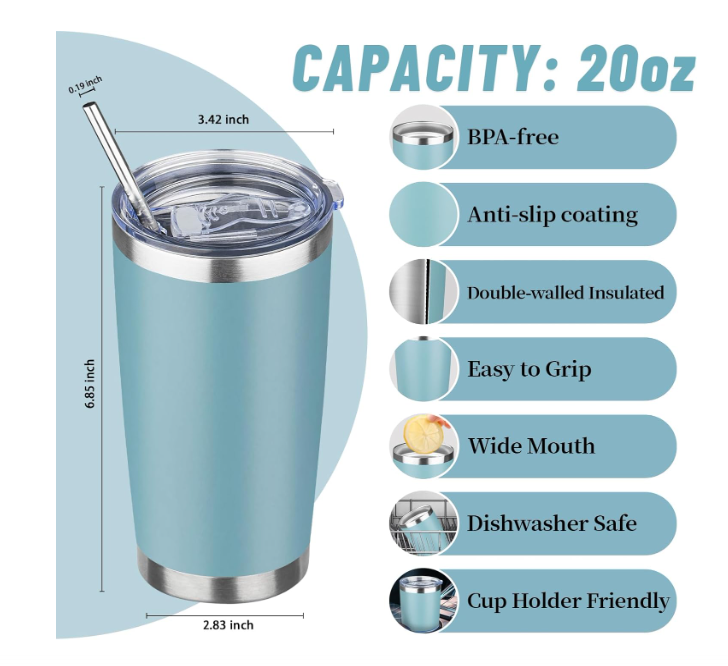 HEALTHY & SAFE MATERIAL: The 20 oz tumbler is made of 18/8 food-grade 304 stainless steel, BPA-free , giving you peace of mind with every sip. The colorful powder coating on the outside is non-slip, rust-proof, and corrosion-resistant . The electrolytically polished interior ensures it is clean and odorless, providing you with a pure drinking experience. HOT AND COLD LASTING COMPANION: This coffee tumbler adopts a double-layer vacuum insulation structure , so both hot and cold drinks maintain the ideal temperature for a long time. Cold drinks stay cold up to 12 hours , and hot drinks stay warm up to 8 hours . HUMANIZED DETAIL DESIGN: The unique 3-in-1 lid supports direct drinking, straw drinking, and wide-mouth drinking . The silicone sealing ring provides excellent leakproof performance. Anti-condensation design avoids water residue, while the wide-mouth design is easy to clean and quick to fill. The tapered cup body perfectly fits car cup holders. VALUABLE GIFT SET, MULTIPLE ACCESSORIES: Includes a splash-proof lid, straw, and straw brush . Available in a variety of stylish colors, suitable as a gift for Father’s Day, Mother’s Day, Christmas, and more . FULL SCENE APPLICABILITY: Ideal for sports, travel, driving, barbecue, camping, and parties . Whether hydrating while working out or enjoying drinks outdoors, it’s always convenient.