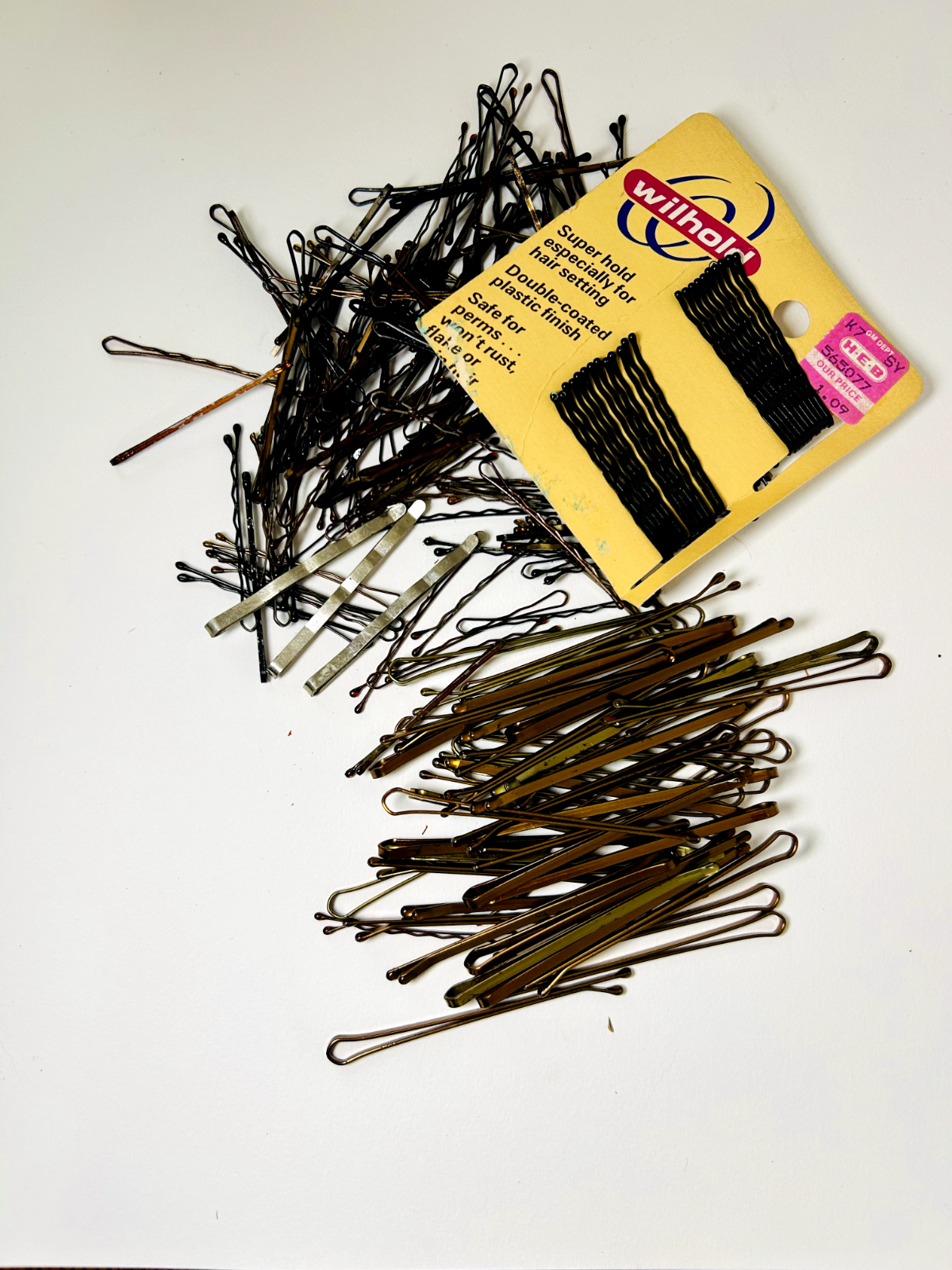Lot of over 200 black and brown bobby pins from the 1980s. Some in new condition. Most in good used condition. Includes over 155 regular sized bobby pins (1.75 inch), 4 decorative bobby pins and 44 large (2.75 inch) bobby pins.