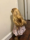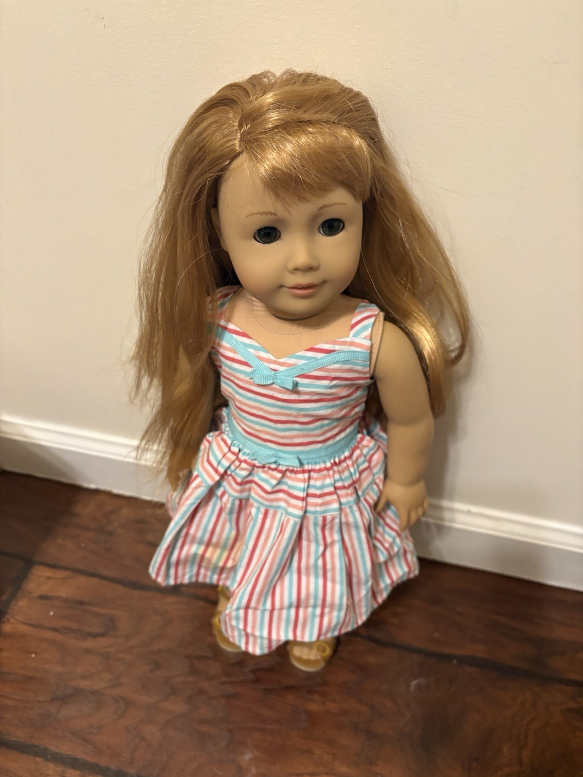 The product is a 2014 American Girl Maryellen Doll complete with a full-size 18" dress, purse, gloves, and bracelet. This play doll features a red wavy hair, hazel eyes, and a light complexion. The doll is part of the American Girl franchise and belongs to the BeForever product line. It is designed for all occasions, suitable for children aged 8-11 years, and weighs 3 lbs. The outfit is made of vinyl and cloth materials, representing Maryellen and Truly Me characters in the American Girl brand.
