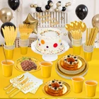 201 Pieces Gold Disposable Party Dinnerware Set - Gold Paper Plates Napkins Cups Tubes Gold Plastic Forks Knives Spoons and tablecloth serve for 25 Guests