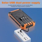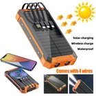 A: 36000mAh Wireless Sol ar Power Bank Featu re : [Built-in 4 Charging Cables] This power bank is built with 3 output cables ( Type C*1 & iOS*1 & Micro USB*1) and 1 USB-A input cable. No matter output or input, you don’t need to carry charging cables. Get rid of messy cables, charge at anytime and everywhere. [Advanced Wireless C harging] This portable charger supports advanced wireless charging, compatible with all wireless-enabled devices. Such as iPhone 14/13/12 series, Samsung Galaxy S23/S22/S21 series, etc. Put your device on the wireless charging area, it gets charged immediately. Come and enjoy your cable-free charging time. [Power 6 Devices at Once] This solar charger is also equipped with 4 ports (iOS input, USB A output, USB C input/output), providing 5V/3A high-speed charging to save time. Along with 4 charging cables and wireless charging, it supports charging 6 devices simultaneously. Keep all your devices alive. Sharing with families and friends is perfect. [Super Large Capacity] With 36000mAh premium Li-polymer battery, this solar power bank can charge your devices multiple times. It can be recharged via adapter and solar power, free your worries of poweroff. Equipped with smart protection IC chip, it guarantees charging safety intelligently. [Sturdy&Durable D esign for Outdoor] This solar battery pack is well made to be Waterproof/Shockproof/Dust-proof, which can withstand the harsh environment outdoors. It’s equipped with Dual super bright LED lights, a Must-Have tool for outdoor activities and home emergencies. Sp e cification : Product name: solar energy with charging cable Function: solar / wired / wireless charging treasure Type-C Output:DC 5V/3A 9V/2.2A 12V1.67A(Max) USB Output 1/2:DC 5V/4.5A 5V/3A 9V/2A 12V/1.5A (Max) Wireless Output:5W/7.5W/10W/15W(Full Compatible) Micro USB Input:DC 5V/2.4A 9V/2A(Max) Type-C Input:DC 5V/3A 9v/2.22A(Max) Size: 183*94*27mm Capacity:36000mAh Material: Plastic ABS+Silicone Battery: polymer battery Colour: orange,black Process: solar panel Applicable scenes: Night reading/camping/emergency/treasure hunting Pac kage list: 1x Solar Power Bank Wireless Charging ================================== B:20000mAh Mini Solar Power Bank (No Wireless Function) Features: [Very convenient] The mobile power bank has an iphone / micro / Type-C charging cable, so there is no need to carry the charging cable with you. The compatibility is excellent, and the mobile power bank can charge all common devices. This is one of the smallest and lightest portable chargers. Higher capacity but lighter, more portable, smaller in size and easier to carry. This is an excellent power bank that is essential when traveling. [High-speed charging and long-lasting battery] 2.1A fast charging, 50% faster than before, providing high-speed charging for your device. Smart chips can reduce energy consumption and increase power conversion rates. High-density and large-capacity lithium-ion batteries provide ultra-high power capacity and strong cycle life. [4 of 1 output port] The portable charger with built-in cable, built-in mini-cable type C cable and Iphone cable is a total of 3 cables and 2 USB output port directly used for all mobile phones. Charging 3 devices at the same time, the output current can reach 2.1A (maximum); the input current is 2A, and the fast charging power supply with a 2A adapter is compatible with 99% of mobile phones. [Ultra-thin design] portable charger, a portable charger that never gets dirty. Only 10mm; ultra-thin mobile power; carry it with you. Portable phone charger with built-in cable. [Your safety, our con cern] The built-in UL certified battery can ensure your safety. Using lithium polymer batteries is twice as safe as lithium ion battery pack chargers. Portable charger with built-in cable. Specifications: Capacity: 20000mAh Input: 5V / 2A (maximum) Output: 5V / 2.1A Weight: 260 grams Battery: Lithium polymer Charging time: 8-10h Packing Included: 1 x Power Bank 1 x User Manual Kindly note: 1. In order to fully activate the battery, please charge it via outlet or computer for 10 hours at least at the first 2-3 uses. 2. Fully charging by outlet takes approximately 10 hours. Do not charge it all day nor over voltage. 3. For safety, DO NOT leave the power bank charging in car in case of high temperature and avoid crashing. Do not make charge while charging itself. 4. To turn on/off the LED light, pleas long press the power button. 5.The energy transformation from solar to electricity is rather slow , Fully charger need 10 days via solar, In daily life, we highly recommend charge it via wall outlet. 6. 20000 mah is a theoretical capacity from the company.You can charge your phone 1-3 times(depending on your phones conversion rate) 7.Solar panel is just a special design,please charge it via socket