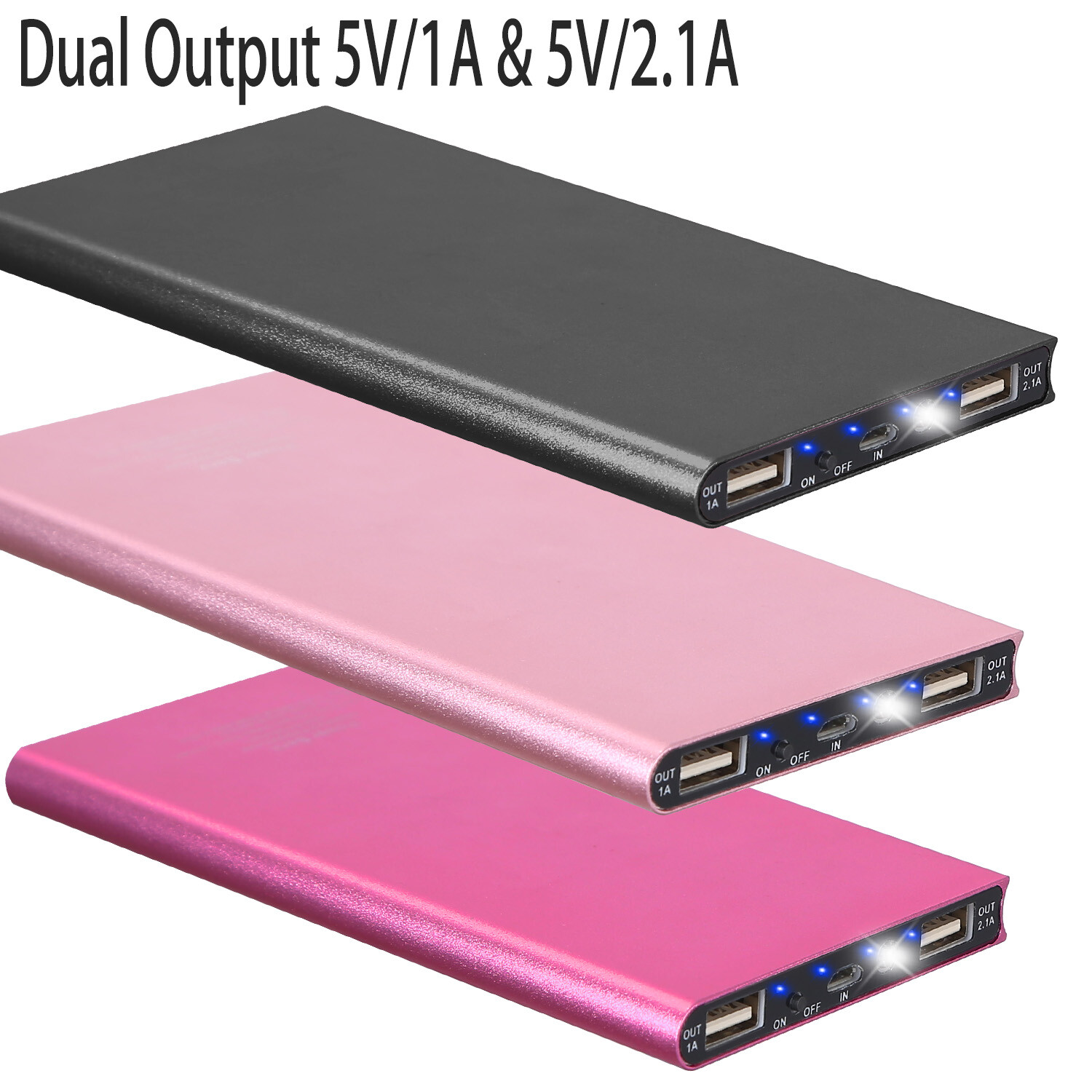 eBay 20000mAh Power Bank Ultra-thin External Battery Pack Phone Charger Dual USB Ports Featured Item Product Detail Image Gallery Product Description Overview: Our mobile power bank provides a total power up to 74W/20000mAh and 4 remaining power indicators of power bank battery, dual USB charging ports with 3.1A total output enables you to rapidly charge 2 devices simultaneously(5V/2.1A&5V/1A), such as phones and tablet PC. Advanced circuit and high efficiency power management to protect your electronic devices from over-current and short-circuit. Ultra-slim size with LED flashlight is portable and optimal for travelling and working. Features: *RELIABLE DUAL CHARGING SOLUTION: Our 20000mAh power bank detects your device automatically and enables to charge 2 electronic devices simultaneously at full speed(2.1A+1A),share the charging ports with your family or friends conveniently. Note:Electric loss may happen in the whole charging process and the recharging times depend on your devices and other factors. *SMART IDENTIFY TECHNOLOGY: Built-in advanced circuits and high efficiency power management that provide safety charging. Protect our power bank and electronic devices from overcharging,over-discharging,short-circuiting,over -current and high-temperature protection. *4 INDICATOR LIGHTS OF REMAIN ELECTRICITY: Show remaining power by exact 4 indicator lights of power bank. One indicator light left is alerting you of the need to charge the power bank. *EMERGENCY FLASHLIGHT: Inbuilt LEDs provides a quick solution for illuminating in the darkness via long pressing its ON/OFF button. *ULTRA-THIN & BUT STURDY: Possibly the thinnest power bank compressed into 1cm /0.39inches thickness. Chic business style with anti-oxidation treatment aluminum alloy materials,durable and heat- abrasion resistant. Our power bank is optimal for travelling and working. Ultra-slim design is easy to hold. Note: 1. Do not drop the power bank or shake it violently. 2. Do not immerse it in the water. 3. Please keep the tidy of power bank interface. 4. Power bank may release heat after a long time of use,this is a normal phenomenon. Specifications: Brand: iMounTEK Product Type: Dual Ports Power Bank Brightness: 425LUX Input Voltage: 5V/2.1A Dual Output: 5V/1A & 5V/2.1A Battery: 20000mAh/3.7V Polymer Battery, 74W Fully Charged of Power Bank: About 5Hrs Working Temperature: -10℃-40℃ Materials: ABS, PVC, Aluminum Alloy With Anti-oxidation Treatment Available Color: Black,Rose Gold, Hot Pink Charging Cable Length: 30cm/11.81inches Item Size: 15x7.2x1cm/5.9x2.83x0.39inches Item Weight: 205g/0.45lbs Package Size: 20.5x10x2cm/8.07x3.94x0.79inches Package Weight: 259g/0.57lbs Package Contents: 1 x Mobile Power Bank 1 x USB Charging Cable Terms & Conditions Thank you for your business !