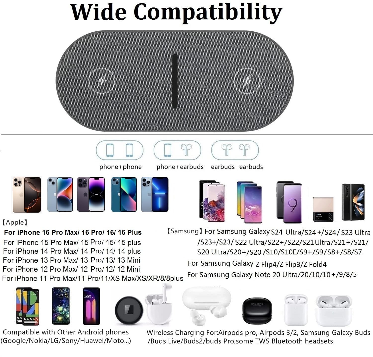 2 in 1 wireless charger pad, you can charge 2 devices at the same time, make your nightstand/desk more tidy. (1) Intelligently adjusts the charging speed, supporting 20/15W/10W/7.5W wireless charging speeds (2) Lightweight,sleek,compact design with non-slip rubber. (3) The charging station uses smart chips to protect your phone from overcharging, overcurrent, overvoltage, overheating and short circuit. It provides you with a safe charging experience. NOTE: 1. Please use a 9V/12V 18W above adapter to ensure that the charger can properly power multiple devices. (Adapter not included.) 2. Don't fit for any smartwatch. 3. Supports phone cases with a thickness of less than 5mm/0.2". You will get: 1* 2 in 1 Wireless Charger pad 1* Charging cable 1* Manual 【2 In 1 Wireless Charger】This dual wireless charging pad can charge 2 devices at the same time without a bunch of chargers plugged into your power outlet and no more cluttered cables. It provides quick charging for 2 devices, up to 20-watts (intelligently identify your phones and selects optimal charging power).convenient and efficient, perfectly solving the problem of charging multiple devices. (NOTE: NEED TO USE QC2.0/QC3.0 18W ABOVE ADAPTER TO CHARGER! NOT INCLUDED!) 【Wide Compatibility】This dual phone charging pad is compatible with iPhone 16/15/14 (Pro,Pro Max,Plus), iPhone 13/12 (Pro,Pro Max,Mini), iPhone 11/11 Pro Max/XR/XR/8/8Plus/SE; AirPods Pro2/ Pro,AirPods 3/2; compatible with Samsung Galaxy S24/S23/S22/S21/S20/S10/S9/S8 series; Galaxy Note20 Ultra/20/10+/10/9/8,Galaxy Buds/Buds+/Buds Pro,Galaxy Buds Live/Buds2/Buds2 Pro, compatible with LG/Google/Huawei and other phones that support wireless charging.(NOTE: Don't fit for any smartwatch.) 【Great for Travel】Lightweight,sleek,compact design with non-slip rubber. This wireless charging pad is just 1cm/0.39inch super slim and takes up very little space make it easier to put it in pockets, a high speed wireless power charging pad can be easily carried during travel or business. The phone wireless charging station supports wireless charging with cases on (NOTE: Cases ≤ 5mm thick only, not including cases with magnetic or metal attachments). 【Safe Charging】: wireless charger station uses smart chips to protect your phone from overcharging, overcurrent, overvoltage, overheating and short circuit. It can effectively extend the battery life of your device and provide you with a safe charging experience. Easily see the charging status of both of your devices with the twin blue indicator lights. The light will illuminate when placing your phone on the charging pad to indicate the charging has successfully started. 【What You Get】2 in 1 wireless charging pad*1, Charging cable*1, Manual*1. Perfect decoration of your desk and perfect gift for your families and friends! Our products have gone through a series of quality inspection processes and provide 2 years warranty and friendly customer service. If you have any questions, please contact us and we’ll provide a satisfying solution. (Email:)