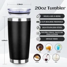 Features: Premium Material: 20oz Insulated tumblers are made of 304 food grade stainless steel with powder coating that won't fade, peel,and also provide additional grip to the exterior. Do not recommend washing in the dishwasher BPA Free Lid: Stainless steel tumbler set with lid and an opening for drinking, be aware of how hot your coffee is before taking a sip. Under normal temperature, the insulated coffee cup keep your water hot for three hours and cold for nine hours Fits Most Cup Holders: 20oz coffee travel mug body height is 6.69",the drink-through lid diameter is 3.38". It also fits in the most car drink holder, Carry around your beverages whether home, office, picnic, hiking or camping adventures Colored Powder Coated Tumbler : Powder coating gives you multiple color options, make an impression on your lucky recipients. Colored powder coated finish on the outside which is better for hand grip. Awesome Tumblers: Everyone loved them!!! You can use these cups to make gifts for yourself, friends and families. It doesn’t hold smells as you switch up your drinks during the day (ginger water,hot tea,coffee)