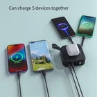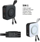 5 in 1 Travel Pro Power Bank- Multifunctional 10000mAh Mobile Portable Charger with Built in Cables - Universal Travel Adapters with EU AU UK, Magnetic Powerpack White 【Supports QI Wireless Charging Devices】: The power bank with wall plug provides wireless charging services for mainstream devices such as iPhnes, Android s, and even AirPads Bluetooth earbuds. Packed with a 10000mAh battery, it will give your devices longer play time. 【Multifunctional Power Solution】: Simplifies your travel needs by integrating a power bank, stand, data cable, and charger into one unit. It's a must-have for business trips and outdoor adventures. 【Versatile Travel Charger with Interchangeable Plugs】: A perfect travel companion, this unit comes with interchangeable charging plugs - UK, EU, AU and US standards. And the innovative pull-out stand design effortlessly secures your , freeing up your hands for other tasks. 【15W Magnetic Wireless Fast Charge】: Simply place your wireless charging-compatible on it and enjoy high-speed charging, wireless charging can reach 15W. And coupled with a USB power output and fast charging adapter, experience top-notch charging speeds. 【Simultaneous Fast Charging of Multiple Devices】: Equipped with smart matching technology, it allows fast charging for up to 5 devices simultaneously. Dual-Mode Power Storage: Full charge achieved in just 4-5 hours via AC plug mode and only 2-3 hours via Type-C mode.