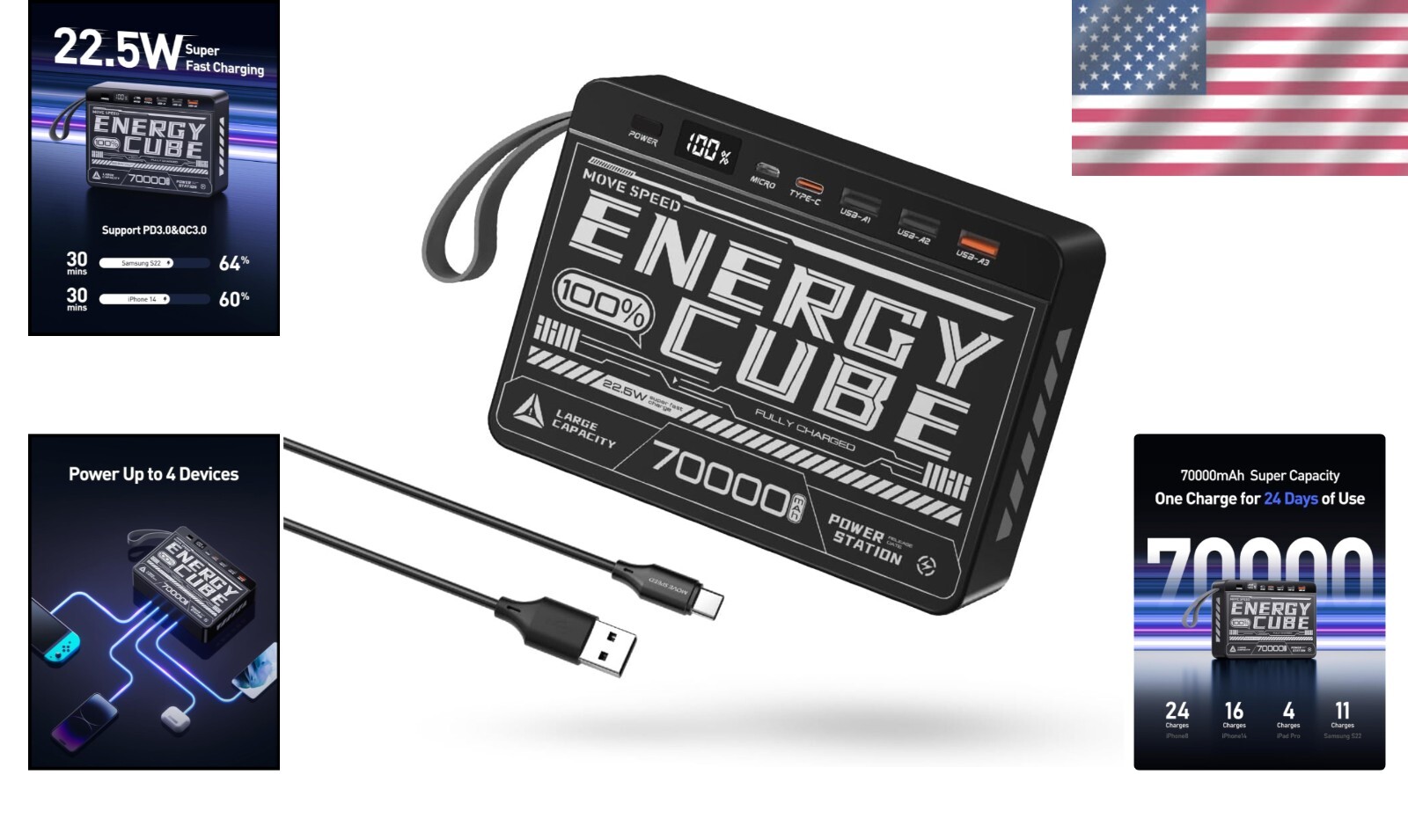 22.5W PD Fast Charge Power Bank, 70000mAh Capacity for Ultimate Portability ‹ › ‹ › ‹ › ‹ › ‹ › ‹ › ‹ › ‹ › ‹ › 22.5W PD Fast Charge Power Bank Experience unparalleled portability and power with our 70000mAh High Capacity Power Bank, designed for the modern adventurer. Features: Massive 70000mAh capacity, providing more than 24 full charges for iPhone 8, 16 full charges for iPhone 14, and 11 charges for Samsung S22. Supports both PD and QC fast charging protocols, ensuring rapid power delivery. 22.5W super fast charging capability—charge your iPhone 14 to 60% in just 30 minutes. 4 versatile outputs (2 USB ports, Type-C port, USB fast charge port) to accommodate multiple devices at once. Made with car-grade polymer batteries, ensuring safety and durability. Advanced safety features include overcurrent, overvoltage, and temperature protection. Convenient hand strap for effortless travel. Fashion-forward cyberpunk style for a unique look. Benefits: Stay powered up for an extended period, making it perfect for travel, hiking, and outdoor adventures. Fast charge your devices and get back to what matters most in no time. Multiple charging options enhance convenience, charging up to four devices simultaneously. Compact design means you won't be weighed down on your adventures. Reliable performance with high-quality safety certifications, ensuring worry-free charging. Why Choose 70000mAh High Capacity Power Bank? Elevate your on-the-go power experience with our Power Bank. With its staggering capacity, rapid charging capabilities, and layered safety protections, it stands out as an essential companion for outdoor camping and travel. Our power bank encapsulates cutting-edge technology while ensuring you remain stylish and efficient. Don't compromise on power or safety—choose reliability and performance that complements your adventurous lifestyle. Order your 70000mAh Power Bank today! Shipping Free & Fast Shipping - We offer free shipping to most of the USA with a normal delivery time of 3-7 days. However, due to the current situation, additional delivery time (up to 3 weeks) may be required for some items. Alternative Carriers - We may use alternative carriers (e.g. USPS, FedEx, UPS, etc.) to ensure your package arrives safely and on time. Due to the use of multiple carriers, we are unable to provide a tracking number automatically. Handling Time - Orders are processed and shipped within 1-2 business days of receiving cleared payment. Shipping Restrictions - Shipping to Alaska, Hawaii, Puerto Rico, Guam, and other US territories may incur shipping charges or delivery restrictions. Please contact us before ordering, or your order can be refunded/cancelled. State Restrictions - There may be restrictions based on your state of purchase. For example, certain items may not be shipped to California due to state regulations. Contact for Tracking Updates - If you require tracking updates or have any concerns about the delivery of your order, please feel free to contact us, and we will be happy to assist you. Return 30-Day Hassle-Free Returns - We want you to be completely satisfied with your purchase. If you are not, you can return the item within 30 days of receiving it for a full refund or exchange. Easy Return Process - To start a return, simply contact us and we will provide you with a prepaid return shipping label and detailed instructions. Restocking Fee - There are no restocking fees for returns. However, the buyer is responsible for return shipping costs if the return is not due to a seller's error. Refund Processing Time - Refunds will be processed within 5 business days of receiving the returned item in its original condition. Payment We accept all major credit cards, PayPal, and Apple Pay for your convenience. Your payment information is secure and encrypted to ensure a safe and seamless transaction. Please complete your payment within 3 days of purchase to avoid any delays in shipping. Feedback Your feedback is extremely important to us. We strive to provide the best products and customer service possible. If you are satisfied with your purchase, please take a moment to leave us a positive review. If you have any concerns or issues with your order, please contact us before leaving negative feedback. We are committed to resolving any problems and ensuring your satisfaction. Contact Us If you have any questions or concerns, please feel free to reach out to our customer support team. You can contact us through the eBay messaging system. We are available Monday to Friday, 9:00 am to 5:00 pm EST, and we will do our best to respond to your inquiry within 24 hours. Thank you for supporting our small family business! UPC: Not Set Wireless Charging Standard: None Item Height: High Capacity Power Bank Item Length: High Capacity Power Bank Item Weight: 3.08 pounds Item Width: Not Set Unit Quantity: 1 Connectivity: Micro-USB,USB-C Items Included: Charging & Data Sync Cable,User Manual Mounting Location: None Compatible Brand: Not Set Compatible Model: Universal,iPhone,Samsung,Macbook,iPad Pro,Switch,GoPro Design/Finish: Cyberpunk Features: Fast Charge,High Capacity,Safety Protections,Fast Charging,Smart Protections,LCD Display,Hand Strap Theme: Not Set Brand: Unbranded Type: Power Bank Number of Ports: 4 Color: Black Voltage: 5 V Material: Plastic Cable Length: Not Set Mounting Type: None MPN: Not Set Country/Region of Manufacture: Not Set Manufacturer Warranty: Not Set Unit Type: lb Personalize: Not Set
