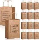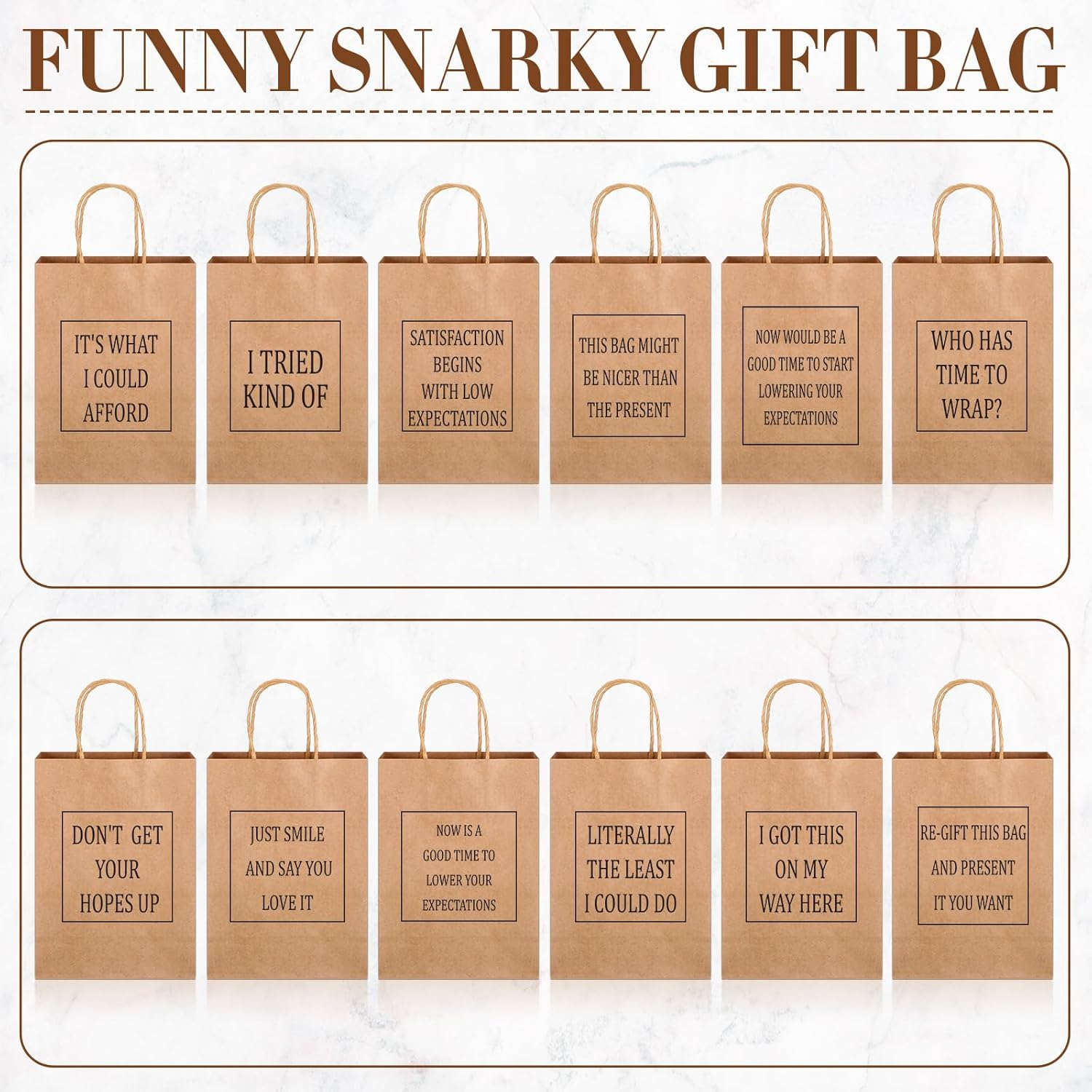 Funny gag gift bags: 24 brown wood color gift bags that are way too cool for regular gifts. Because who said wood gift bags can't be the life of the party? You will receive 24 pieces of funny present bags including matched words; You just need to wrap your holiday gifts, party favor bags and the sufficient quantities and designs can meet your daily needs. Fun gift bags add more humor and fun to your regular party Sayings the scream "You're Welcome!": Featuring funny messages on the bags like "Don't get your hopes up", "Just smile and say you love it", "Now is a good time to lower your expectations", "Literally the least i could do", "I got this on my way here", "It's what i could afford", "Re-gift this bag and present it you want", "I tried kind of", "Satisfaction begins with low expectations"... and "Now would be a good time to start lowering your expectations". Because subtlety is overrated Suitable for any occasions: Funny gift bags for your friends, family members, coworkers, neighbours, boyfriend... Most of all will get a good laugh from the recipients! It is suitable for any occasions: party favor supplies, thank you gifts for coworkers, Christmas gifts for women men, White elephant gift bags, birthday gift bags, funny gag gift bags, goodie bags, Valentines day, Easter, graduation, employee appreciation day, Mothers day, Fathers day Wide application and suitable size: This funny gift bags are measuring approx. 21 x 15 x 8 cm/ 8.27 x 5.91 x 3.15 inches, and the suitable size makes them nice for wrapping standard-sized books, jewelry, candles, scarves, small decor items, and so on. While they're great for humorous gifts, they're also a fun way to wrap any present, adding a touch of humor to even the most sincere gifts. Funny party favor gift bags, funny gift bags, funny wrapping paper gift bags Pack a lot of stuffs: you can use these novelty present bags to fill with cookies, biscuits, candies and presents and so on, and then you can send these simple and humorous bags to your guests, neighbors and colleagues. Funny Christmas gift bags. the small Christmas paper treat bags with handles are suitable for packaging treat, sugars, little stuff, religious plush toys. It's nice for Christmas parties, family gatherings, gift stuffing, and gift wrapping for parties Item: funny warpping paper gift bags with handles Numbers: 24 pieces Color: Wood Occasions: any holidays, such as Christmas, white elephant, party favors, thanksgiving, new year, Valentines day, easter, birthday, employee appreciations day, graduation, Mothers day, Fathers day, wedding, bridal shower... Features: This gift bag set comes with 24 pieces, 12 styles, 2 of each. The bags are printed with fun gift-giving sentences that will make the person receiving the gift feel full of thought!