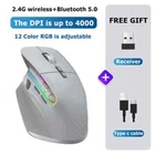 Connect With Computer: 2.4G Wireless Mouse 2.4G Wireless Mouse&Buletooth Mouse 2.4G Wireless &+Wired Gaming Esports Mouse 10000DPI Photoelectric Resolution: 1000-1600-2400-3200-4000DPI Number Of Keys: 6 Buttons Interface: Type C Ergonomics: Support WiFi Range: 10M Working Method: Optical Direction: Four-Way Roller Product Size: 125 X 85 X 51mm Charging input:500mA Support System:XP/Win7/Win8/Win10/Mac OS X Package: 1 x Mouse 1 x USB Receiver 1 x Type C Charging Cable