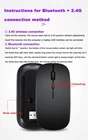 Feature: - Ultra-slim Design:Fashionable and convenient. - Strong Anti-interference Ability: Long working distance up to 10M. - BT 5.1 + 2.4GHz Dual Mode:The dual-mode wireless mouse only needs a switch to realize the free switching of a mouse between two devices. It can connect a device through bluetooth and another device through a 2.4GHz USB receiver. Note: You can't use Bluetooth mode and 2.4G mode at the same time. - USB Rechargeable:With built-in 500mAh battery. Intelligent no-light design,extremely long stand-by time. - Scroll Wheel Zips:You can surf the internet with ease and speed. - Adjustable 3 Level DPI: Switch DPI levels among 800, 1200 and 1600 to to meet your needs with high precision. - Smart Hibernation: Automatically enter the power saving mode without using, enter hibernation mode without using for a long time, click any mouse button to wake up. - Silence Click: Special soundless design for the right and left buttons, make you concentrate on working or playing games without disturbing others. - RGB LED Light:LED breathing light, gorgeous and fashionable. - USB Plug & Play: Come with USB receiver, plug and play. Specification: Material :ABS Bluetooth Version: 5.1 Keystroke life :3 million times Number of keys: 4 Color:Matte Black/Silver Tracing System: Optical Transmission distance: 10 m/33ft Battery: 3.7V lithium battery Battery capacity: 500mAh DPI: 800-1200-1600 DPI (the default is 1200 DPI) Charging time: about 4h Working time: about 7-30 days (depending on usage habits) Operating System: Windows, MAC OS and Linux ect. Size:11.2*5.8*2.5cm Package included: 1 x Wireless Mouse 1 x USB Receiver 1 x USB Cable